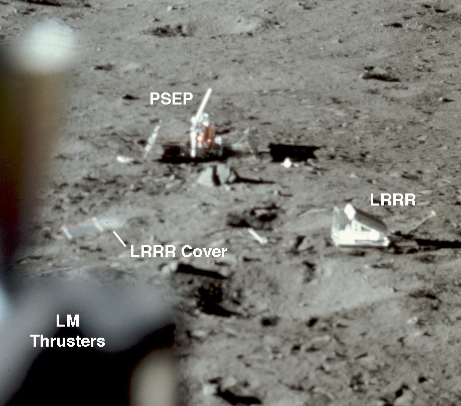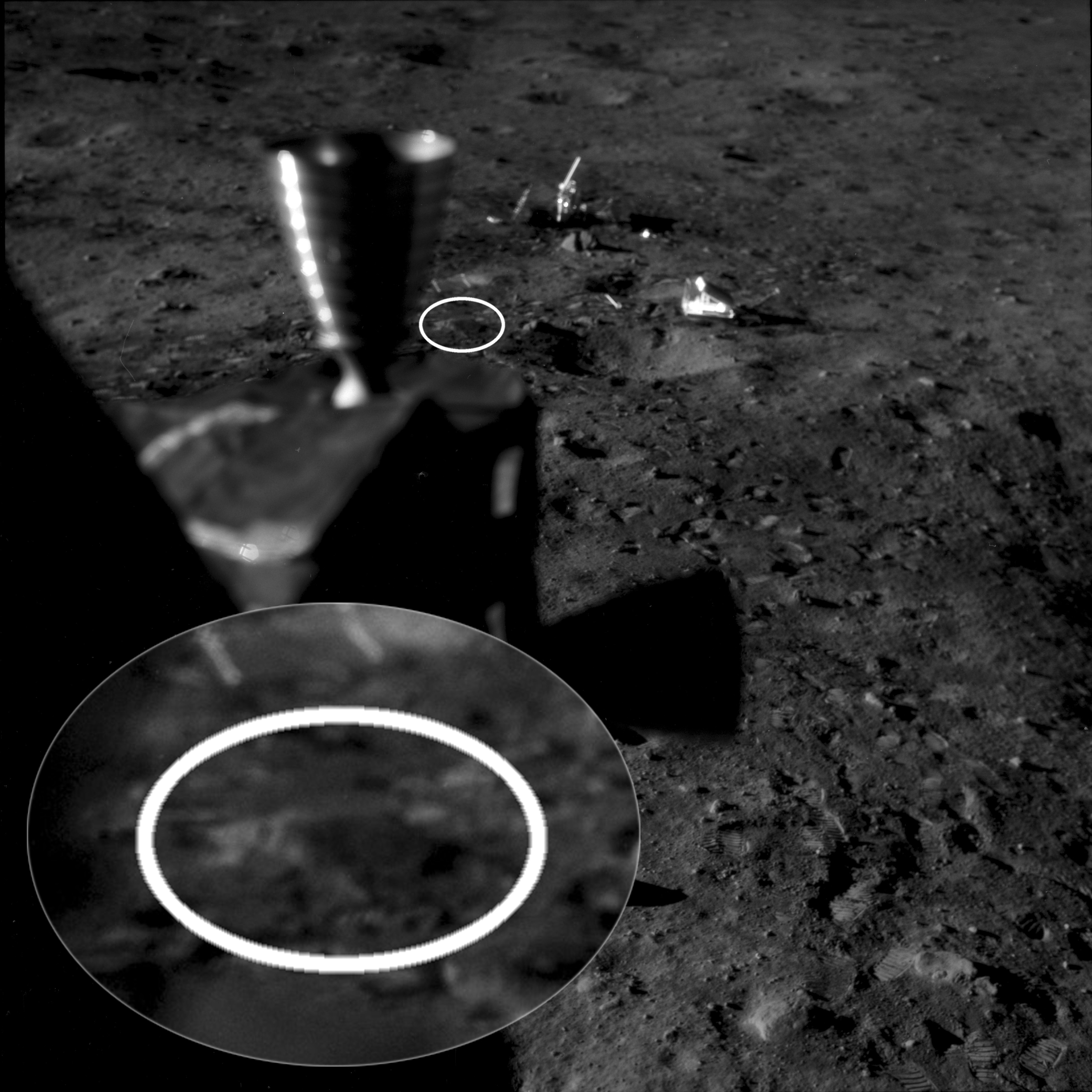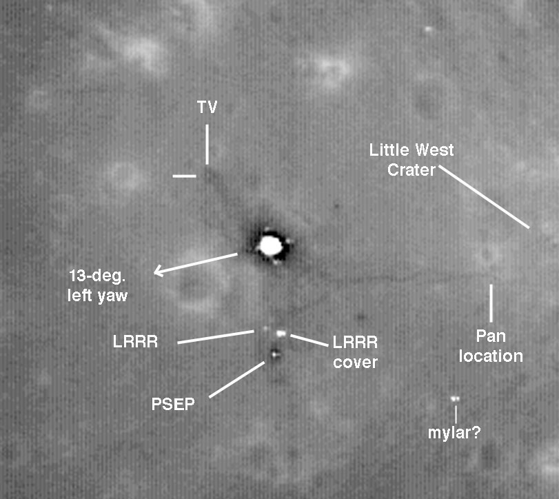 LRRR, LRRR cover, PSEP, and good definition of Neil's track out to Little West. The raw LROC file is M129133239R. The landing site lat/long is 0.67N/23.47E. The LRO spacecraft was at 0.7N/23.61E.18 June 2010 10:00:42 UTC; Solar El/Az 10.8/89.7 ; LRO altitude 40 km. (4.4 Mb)Deconvolved, 0.25 m/pixel (4.9 Mb TIF) and 0.5 m/pixel (3.1 Mb TIF) versions by GoneToPlaid.