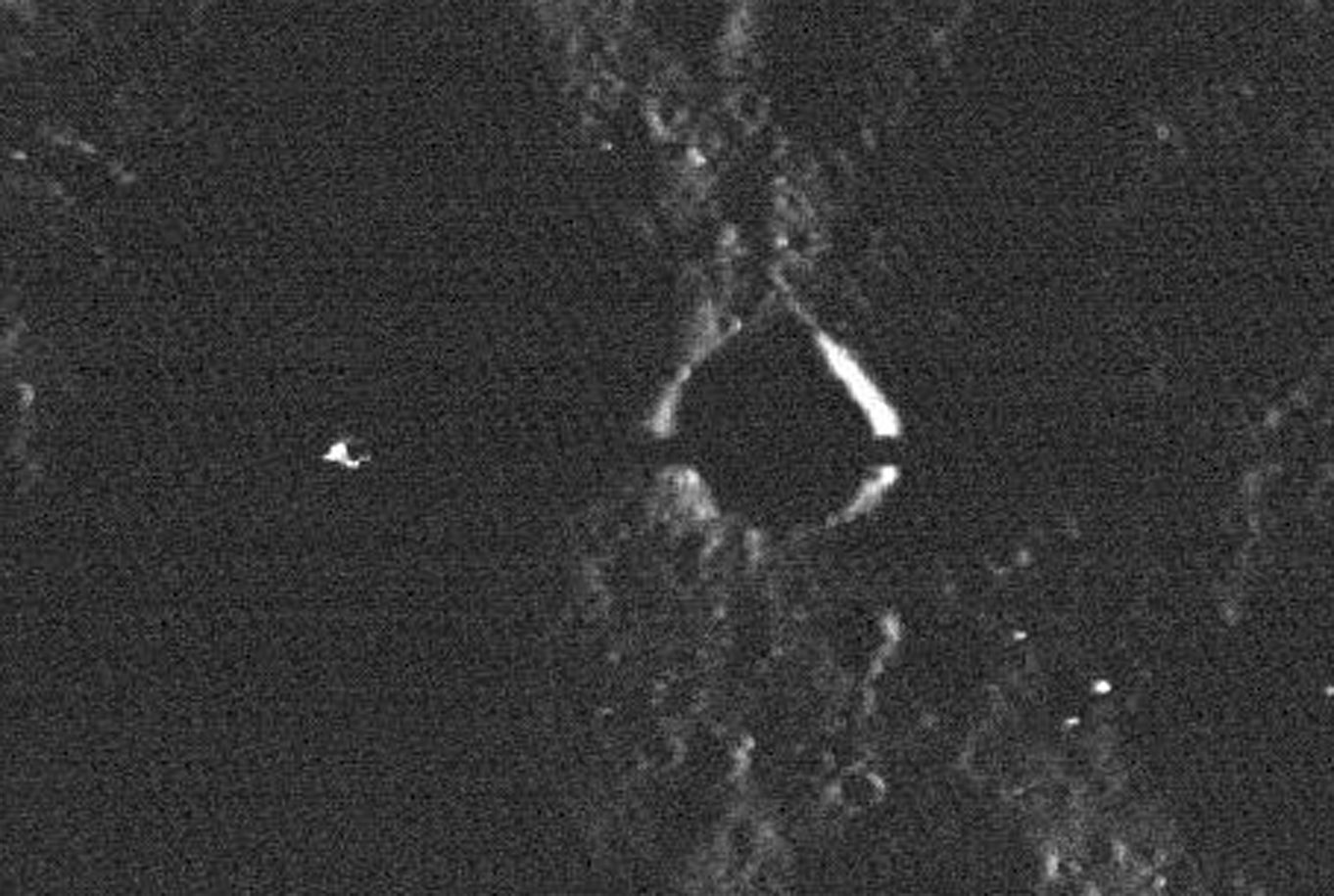 Reasonably bright, point-like reflections off the LRRR and PSEP. The raw LROC file is M119693197L. The landing site lat/long is 0.67N/23.47E. The LRO spacecraft was at 0.03N/24.00E.01 February 2010 - Second Image - 21:45:17 UTC; Solar El/Az 34.0/270.3; LRO altitude 41 km. ( 1.3 Mb)Deconvolved, 1.0 m/pixel (2.7 Mb TIF) version by GoneToPlaid.