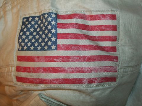 Photo taken at National Air and Space Musuem's Garber Facility courtesy Ulli Lotzmann. April 2006.Original U.S. Flag on Neil's Flown Suit ( 43k )