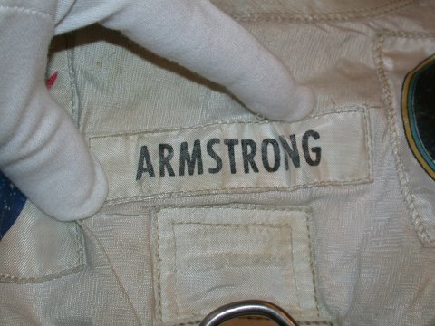 Ulli Lotzman poses with Neil's flown suit at the National Air and Space Musuem's Garber Facility. See, also, Karl Dodenhoff's connector layout diagram. Ulli notes, "The patches and name tags and the Apollo 11 suits were never removed - they are the original, flown ones." April 2006.Original Name Tag on Neil's Flown Suit ( 41k )