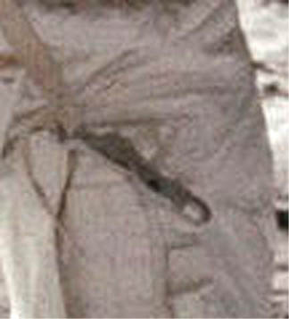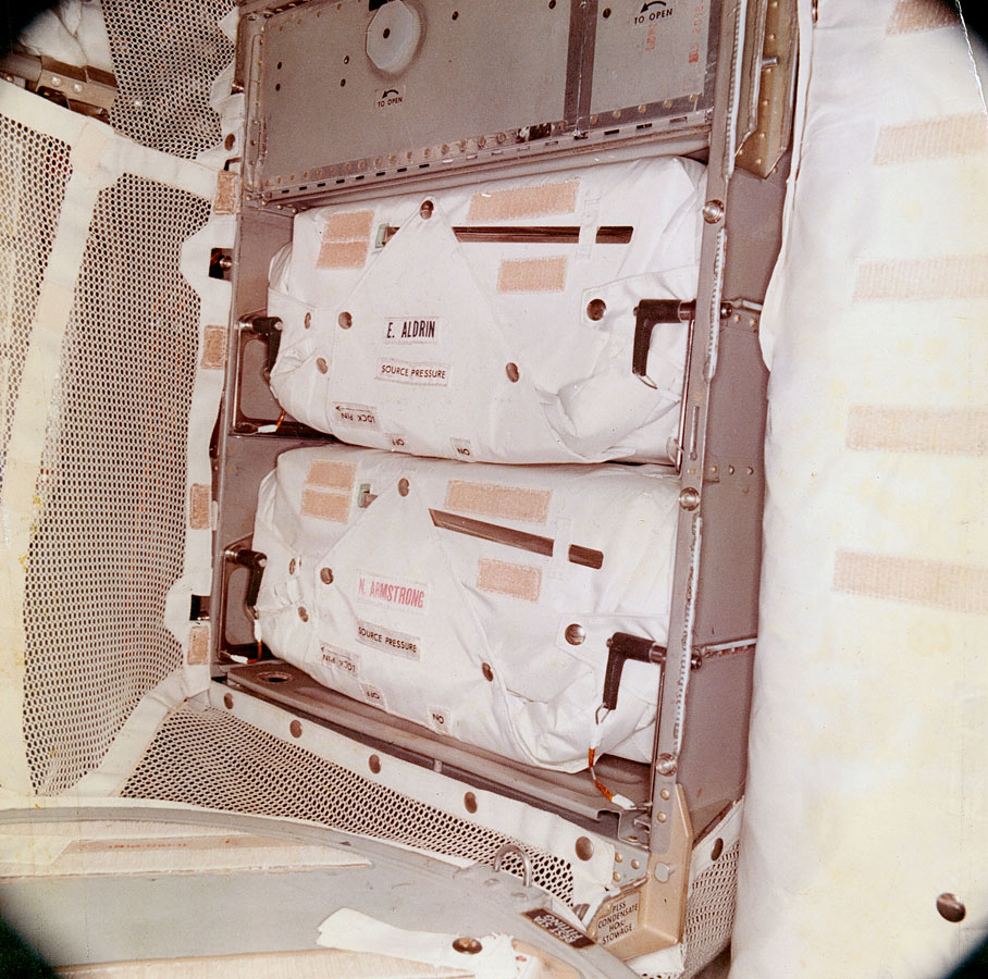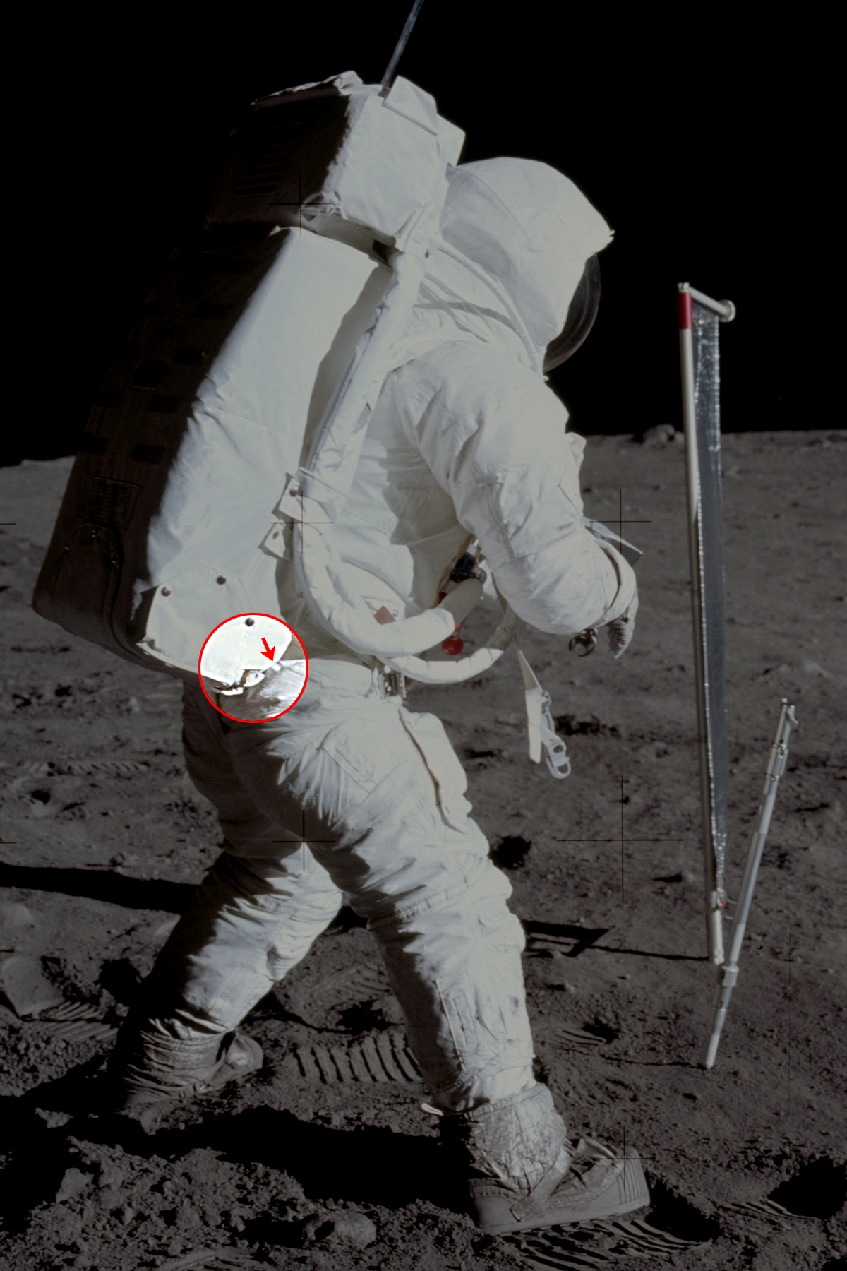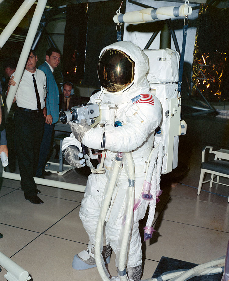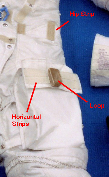 View of the front and righthand surfaces, showing the frame counters and the 'Mag. R' decal. October 2004. Photo by Ulli Lotzmann at the National Air and Space Museum.Buzz's Flown Suit ( 67k )