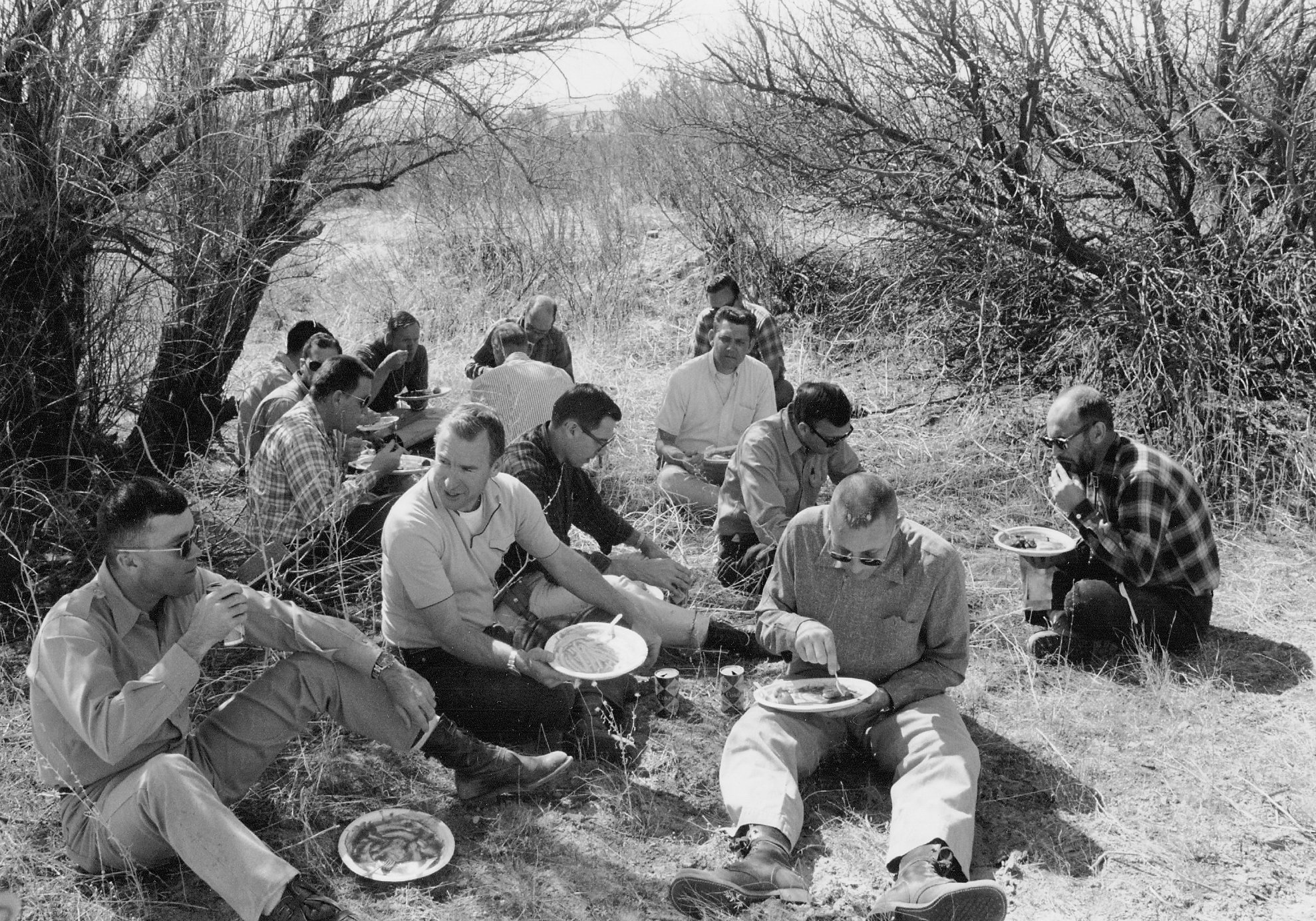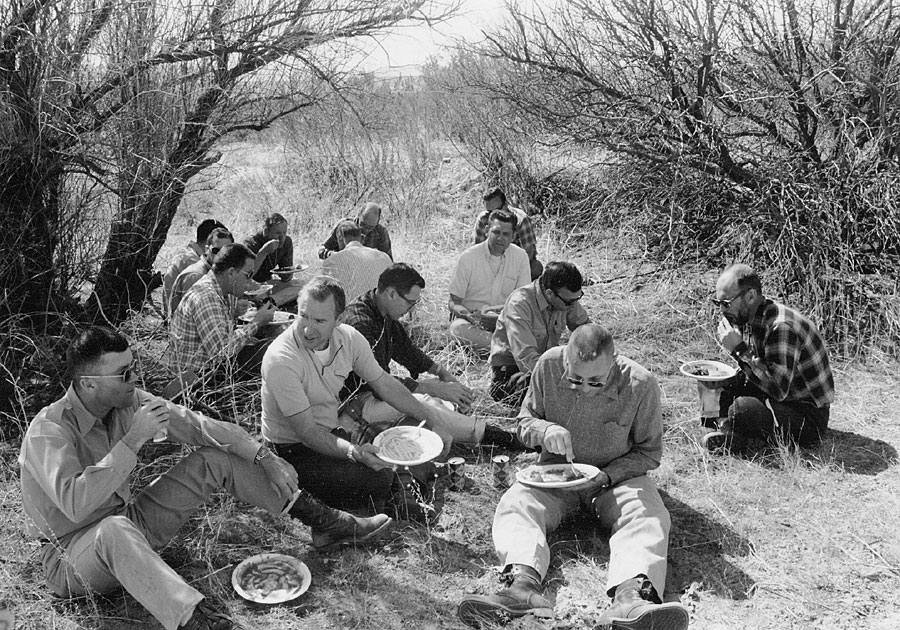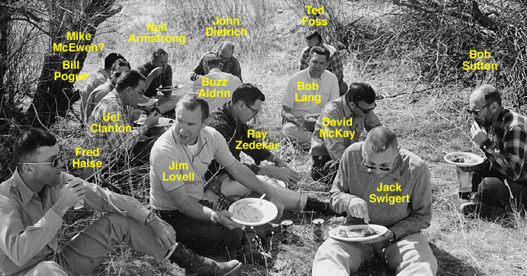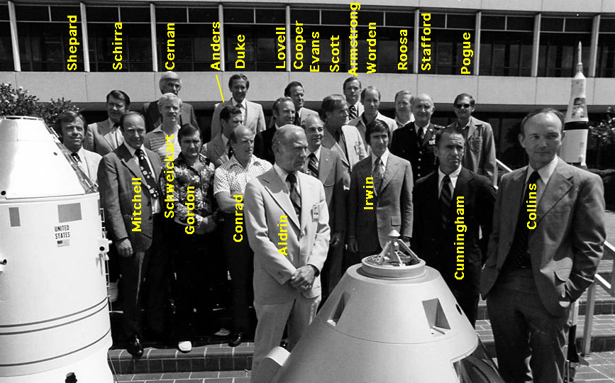 Astronaut reunion at NASA Johnson. See a labeled detail for identifications, some of which were provided by Jack Schmitt. 22 August 1978. Scan by J.L. Pickering.Flight Suits at NASM ( 40k )