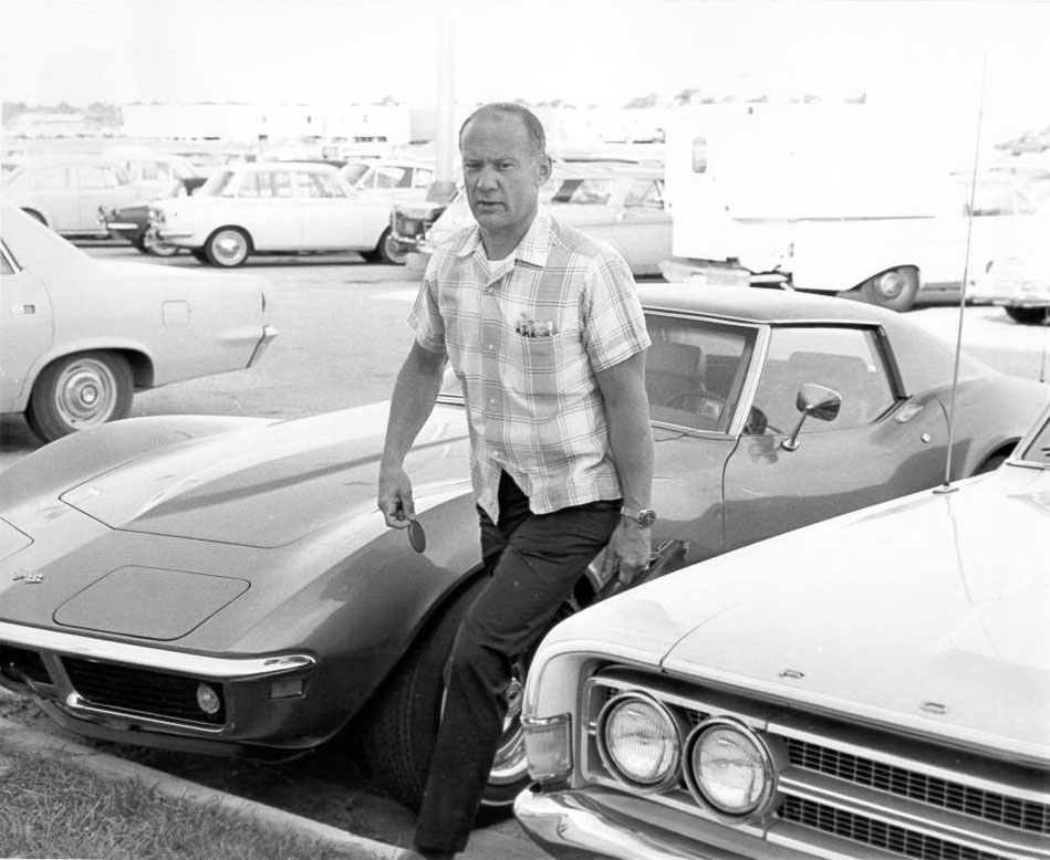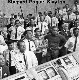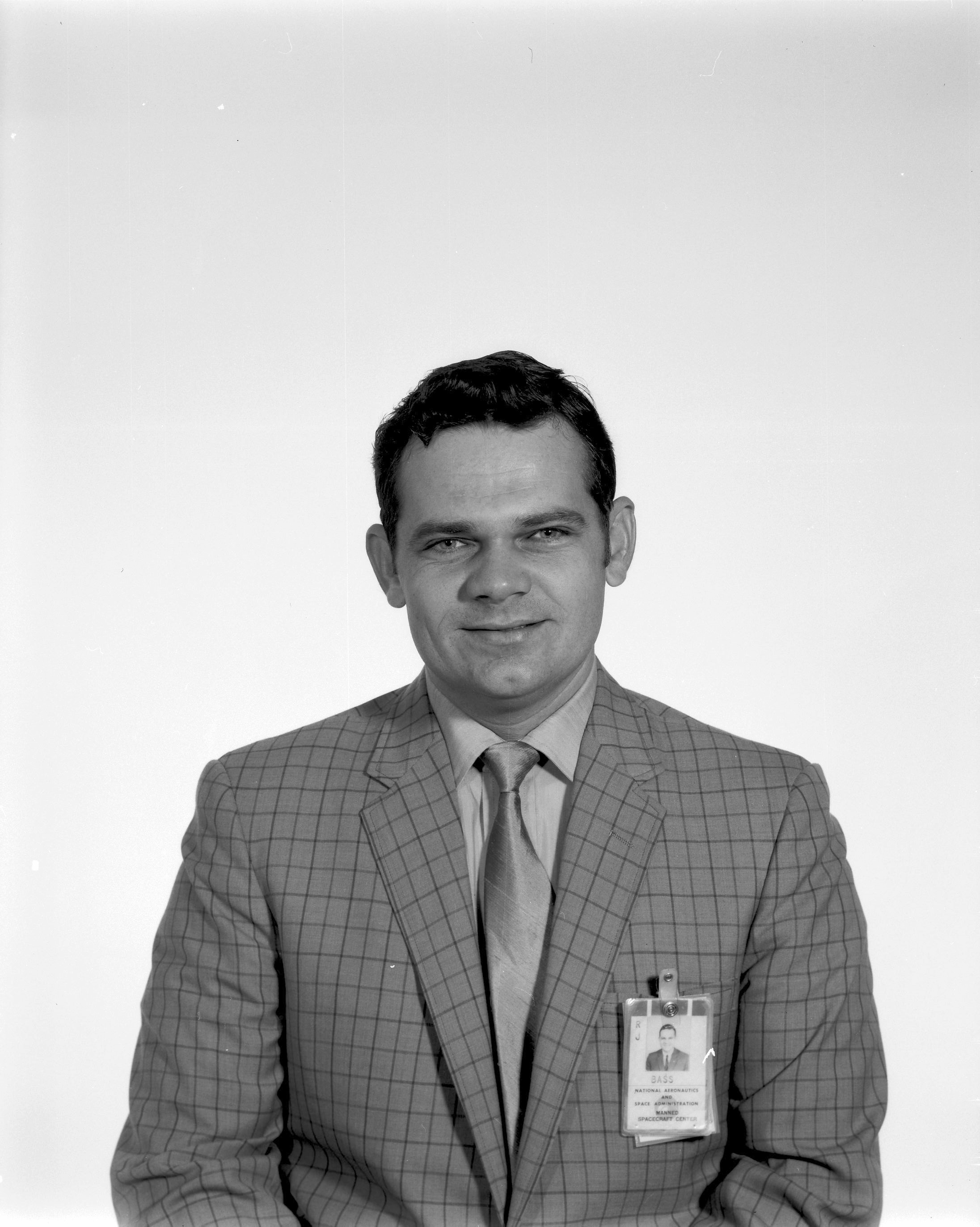 In this full version of the photo, the man in white shirt and tie to the right of the marine is Roderick (Rod) Bass. His daughter, Kristen, tells us that he used to say "To remember my name, just remember, use the Rod to catch the Bass" (smile)." Kristen adds, "He was involved in Mercury, Gemini, and Apollo, training both the crews and the recovery crews. He is no longer alive: passed away in January '91 from a cancerous brain tumor at the age of 52. We are left with exciting and loving memories." Photo filed 24 July 1969. Scan - and Rod Bass 'mug shot' - courtesy MIke Gentry/NASA Johnson.KSC-69PC-429 ( 104k )