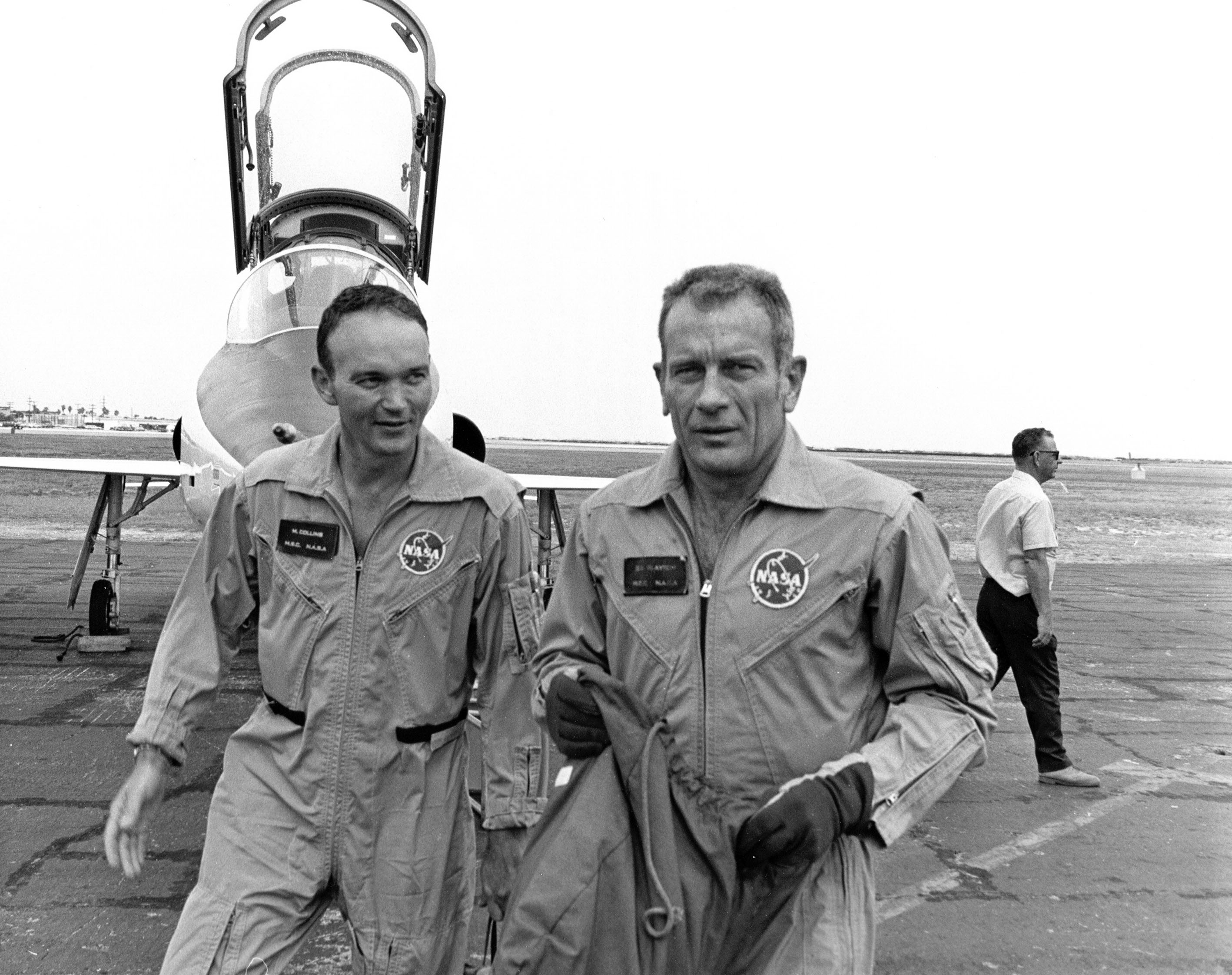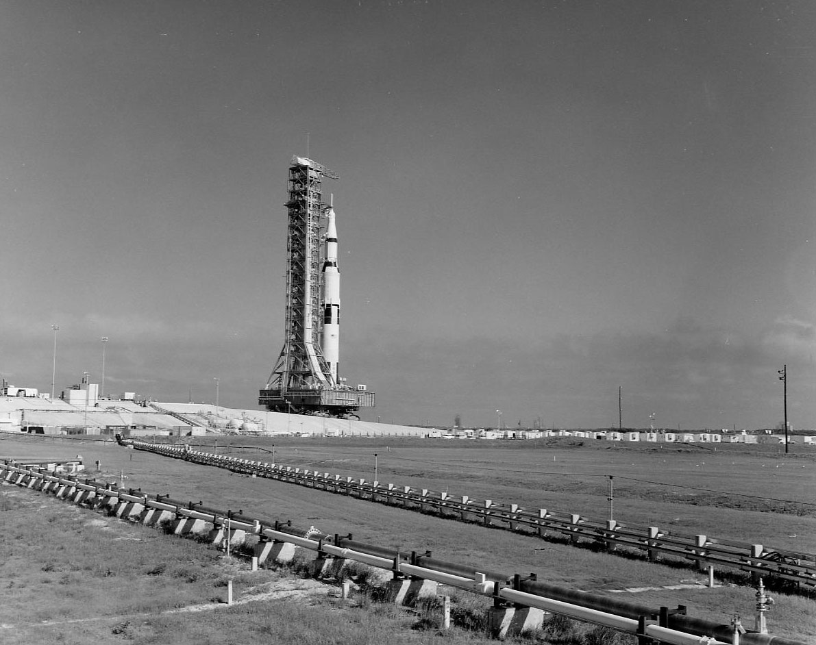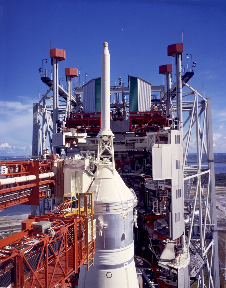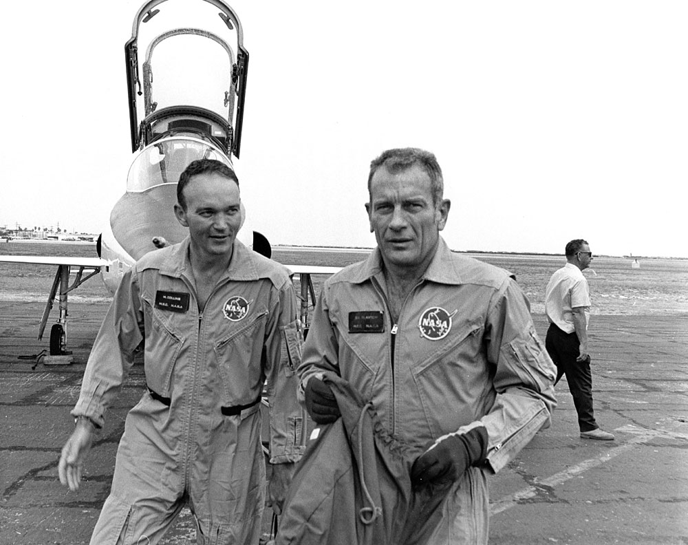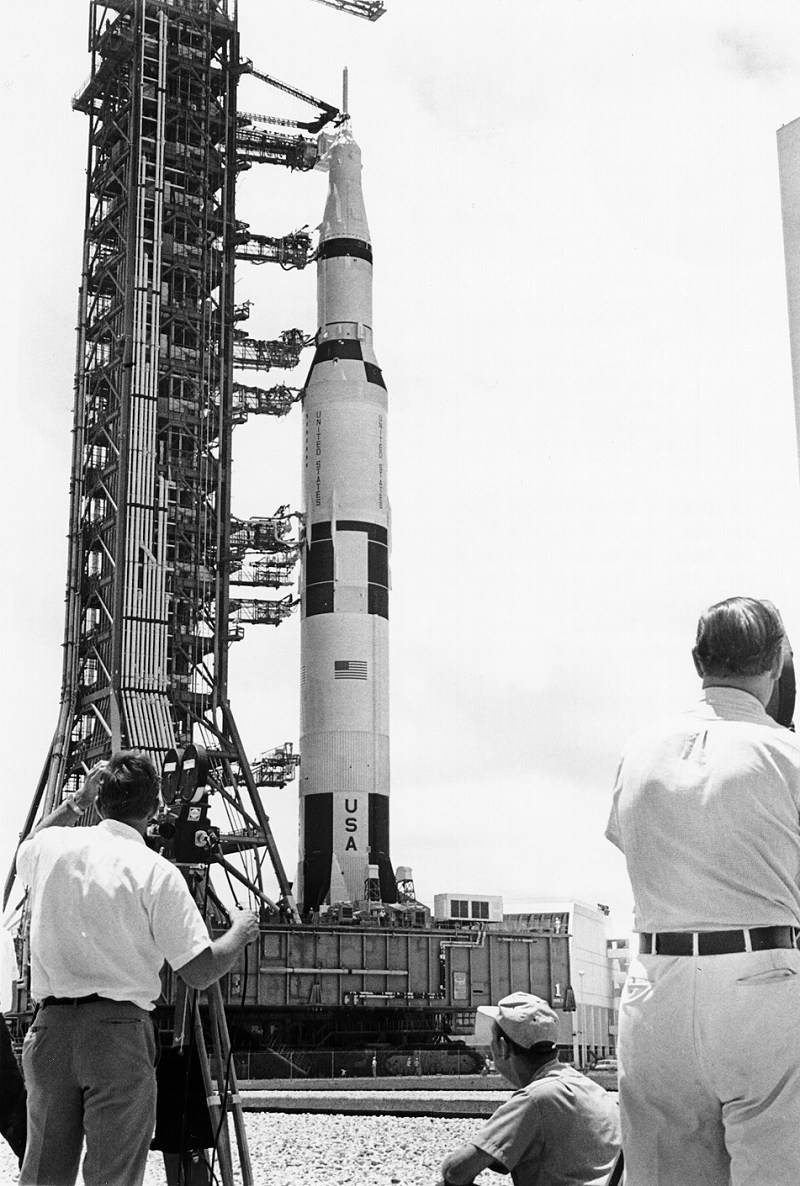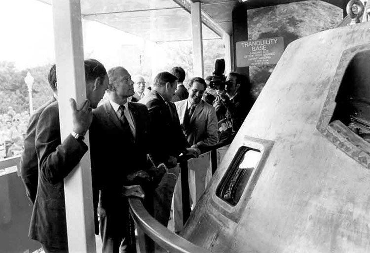 Mike Collins (holding the post) and Buzz Aldrin examine Columbia on the first anniversary of the Apollo 11 landing. Neil Armstrong may be the individual hidden by the post. Photo filed 20 July 1970. Scan by Frederic Artner.Launch Complex 39 (166k)