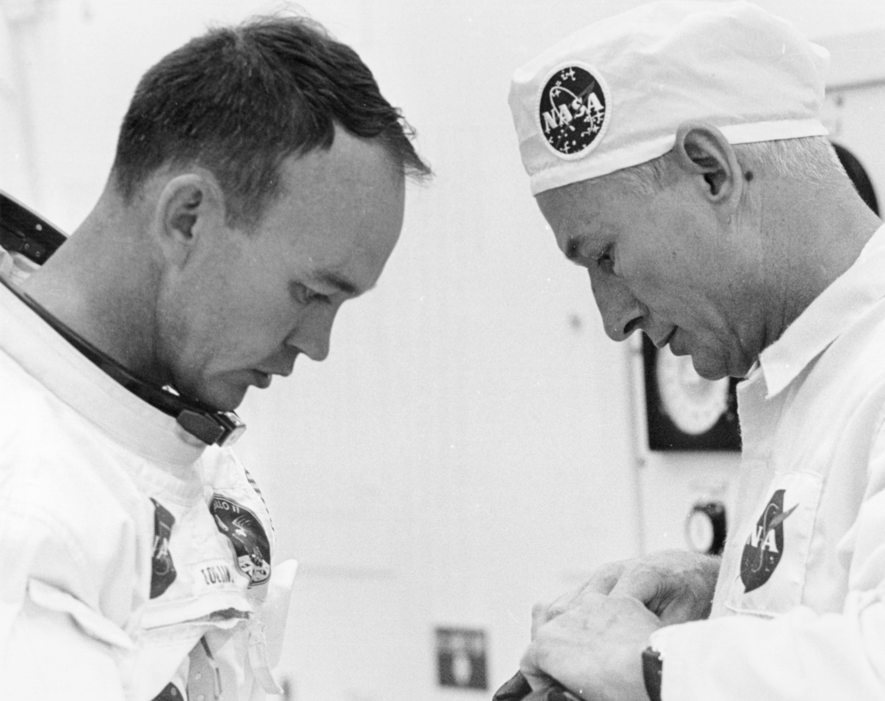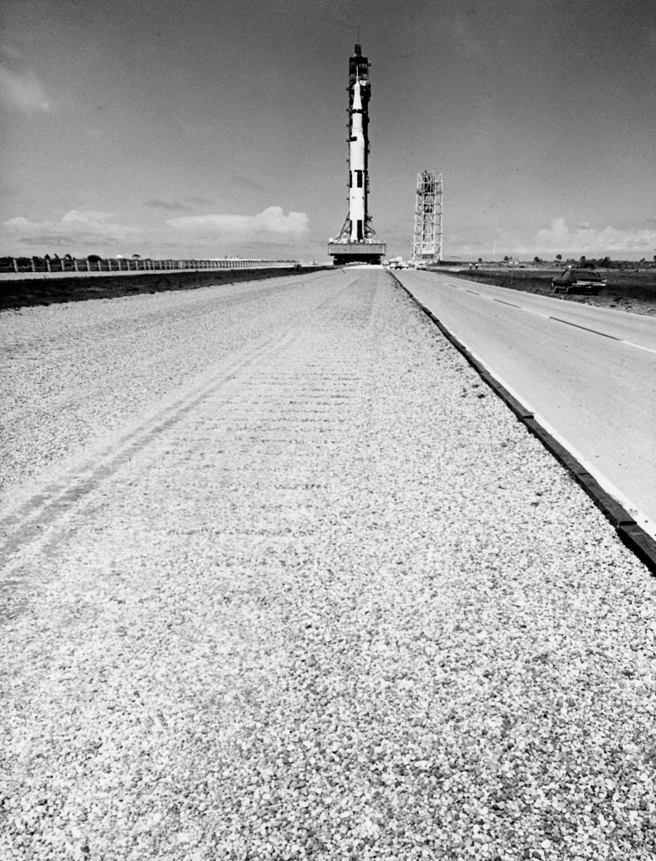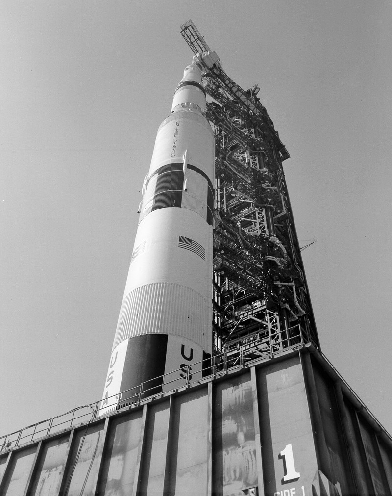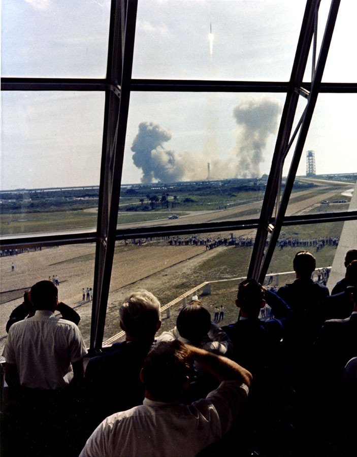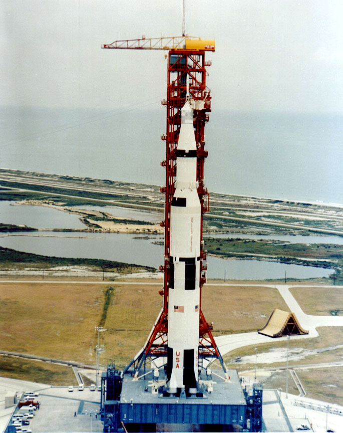 Mike Collins (holding the post) and Buzz Aldrin examine Columbia on the first anniversary of the Apollo 11 landing. Neil Armstrong may be the individual hidden by the post. Photo filed 20 July 1970. Scan by Frederic Artner.Launch Complex 39 (166k)