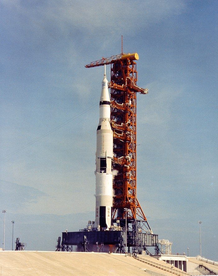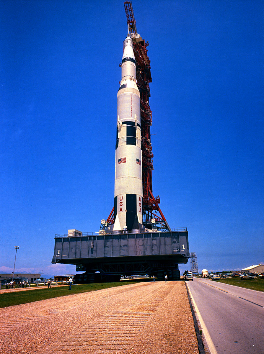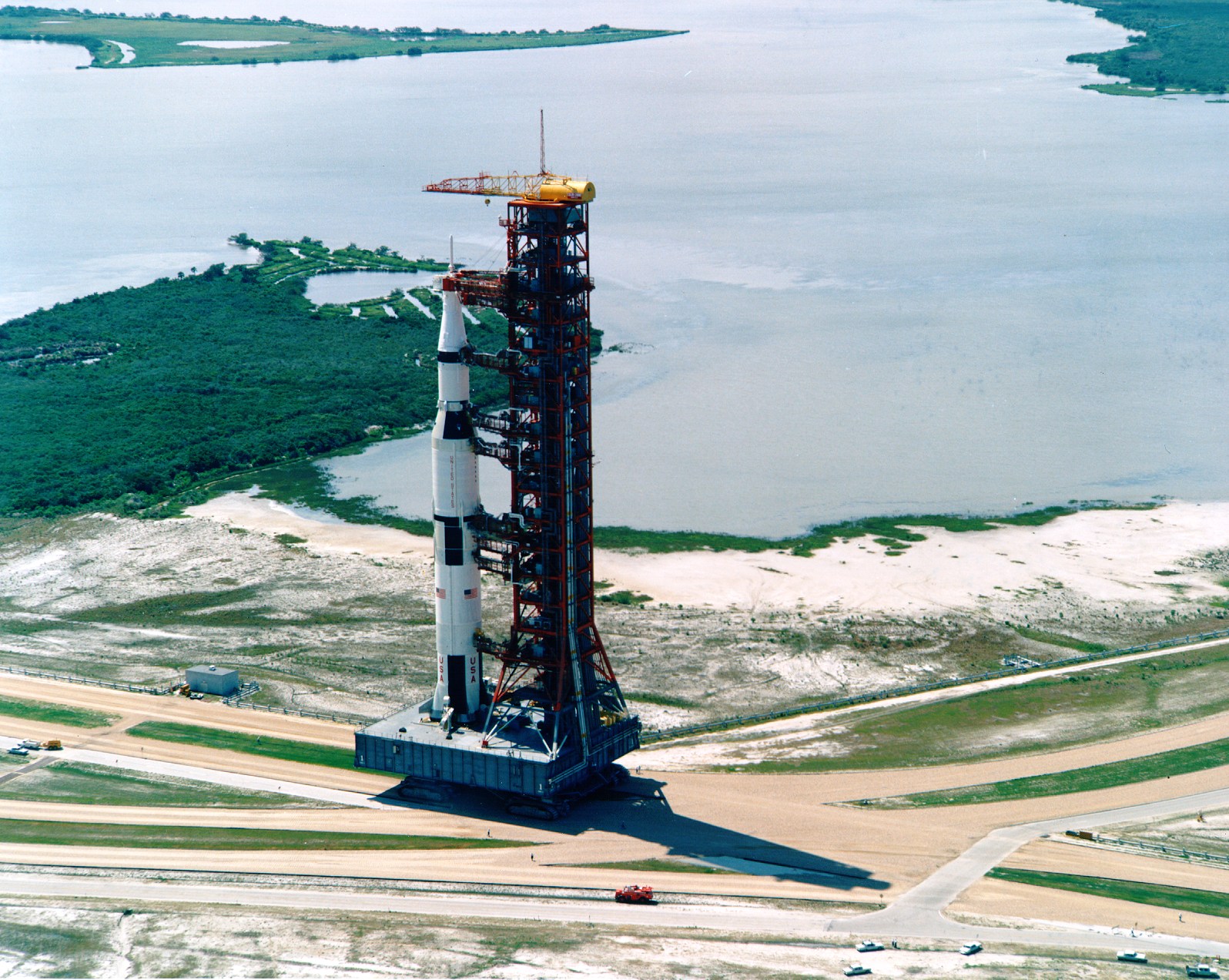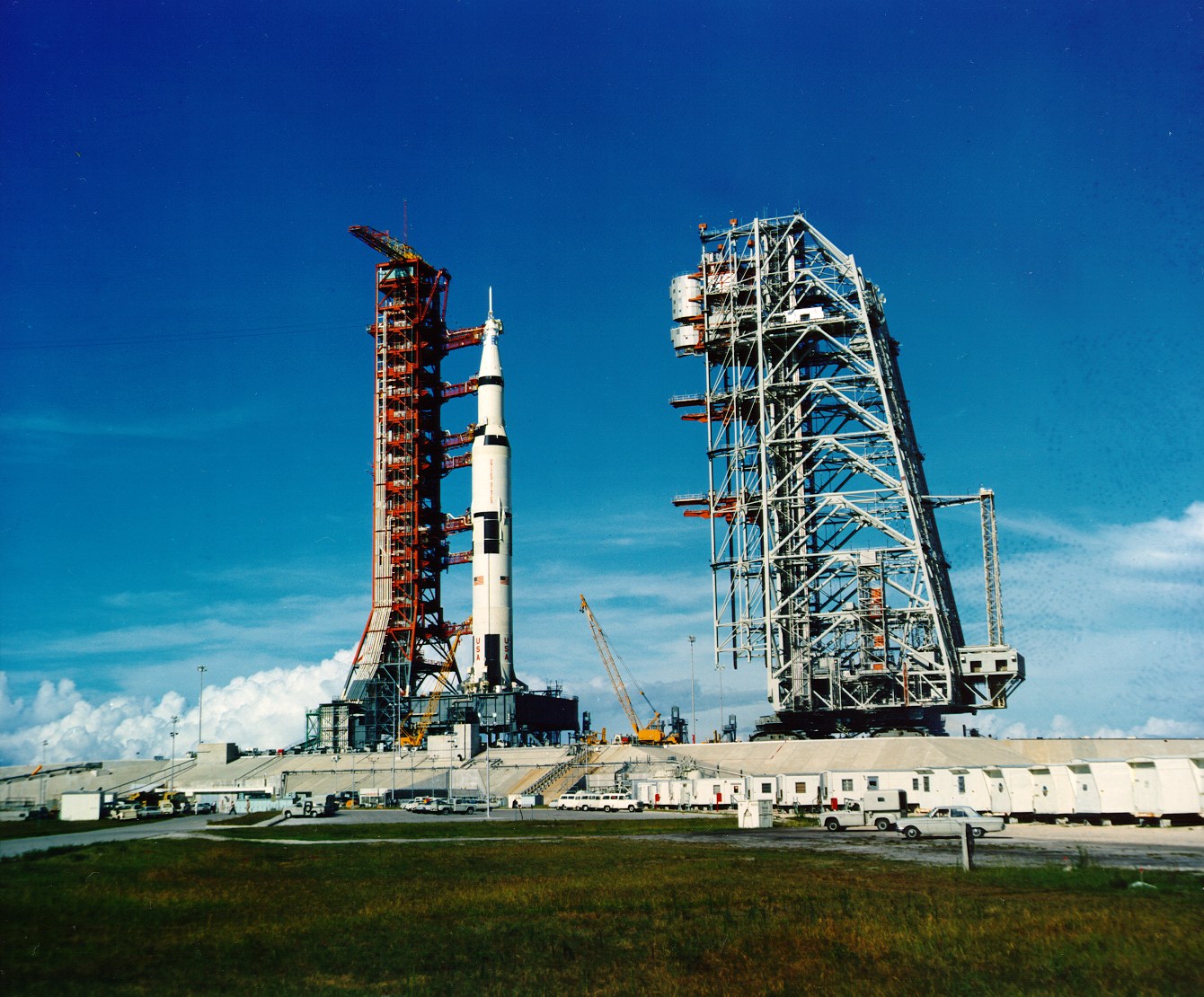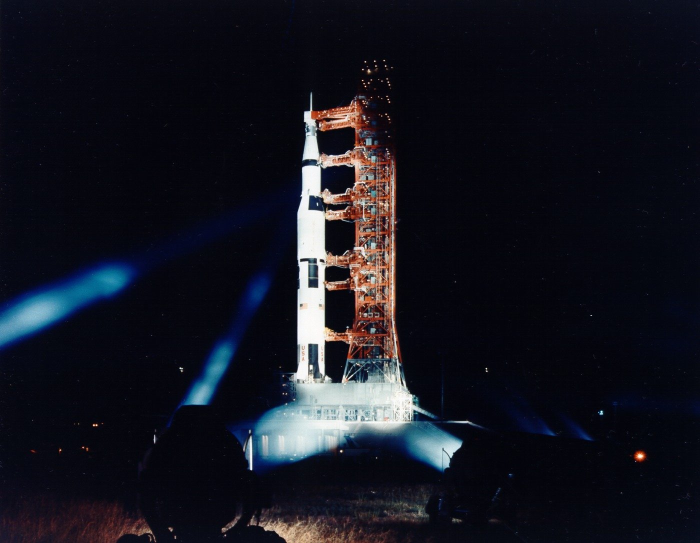 Mike Collins (holding the post) and Buzz Aldrin examine Columbia on the first anniversary of the Apollo 11 landing. Neil Armstrong may be the individual hidden by the post. Photo filed 20 July 1970. Scan by Frederic Artner.Launch Complex 39 (166k)