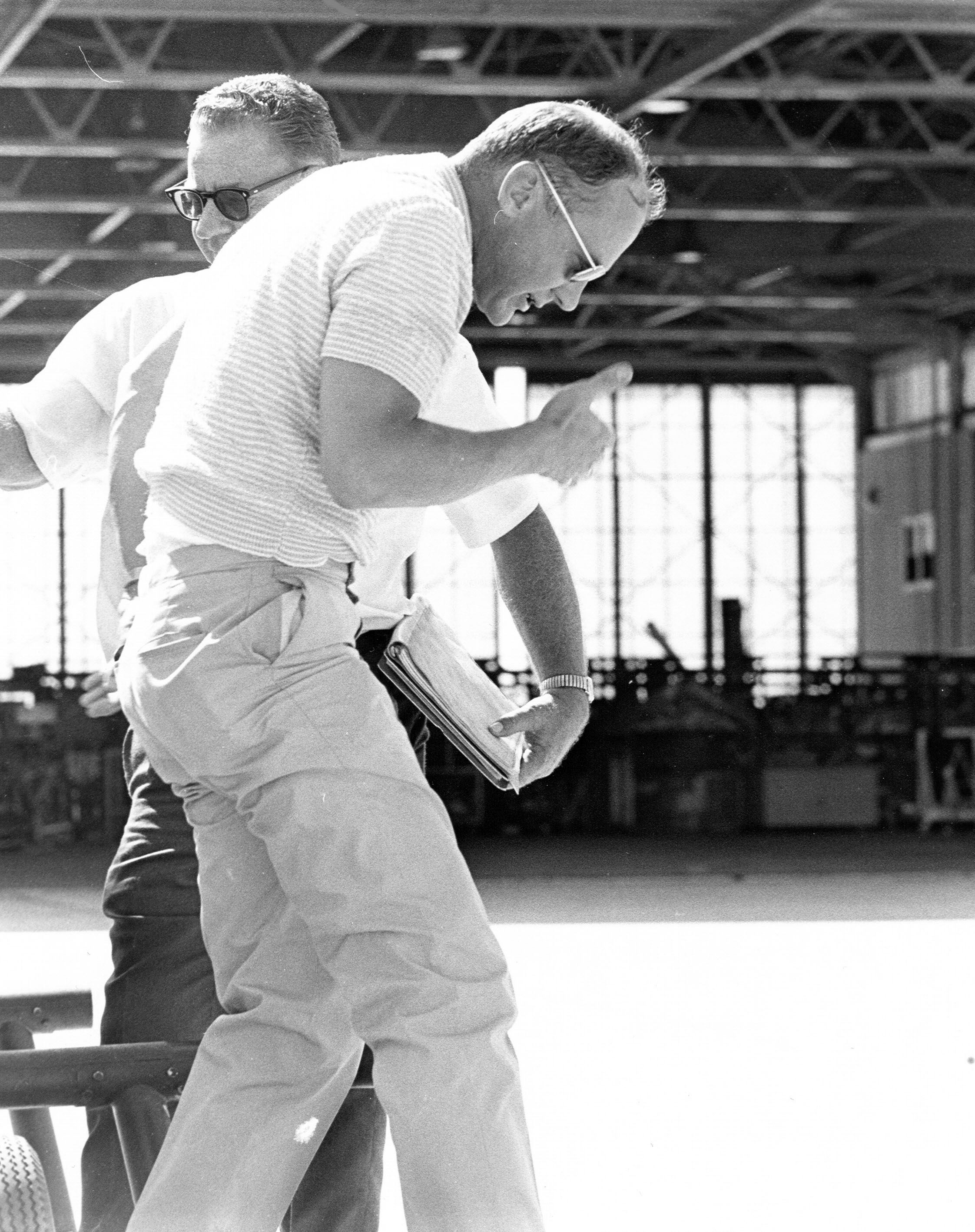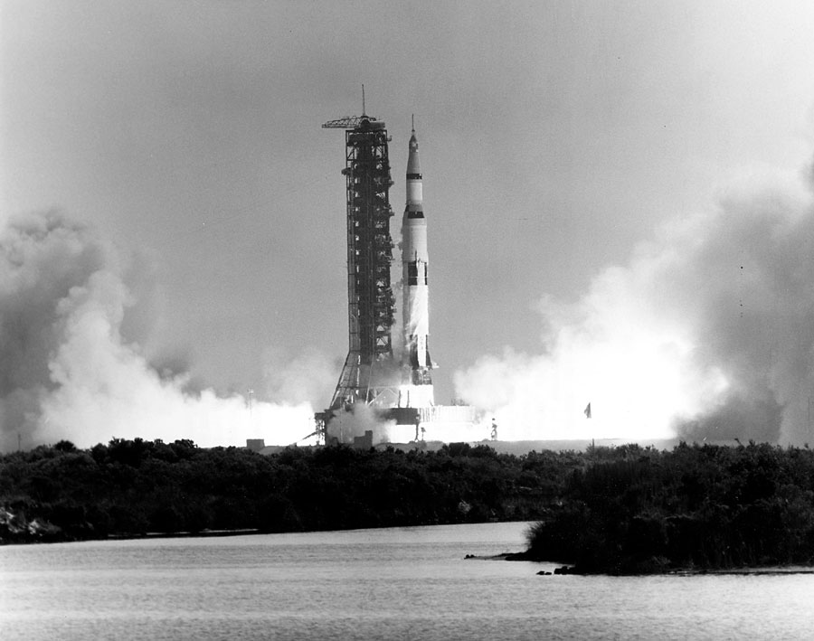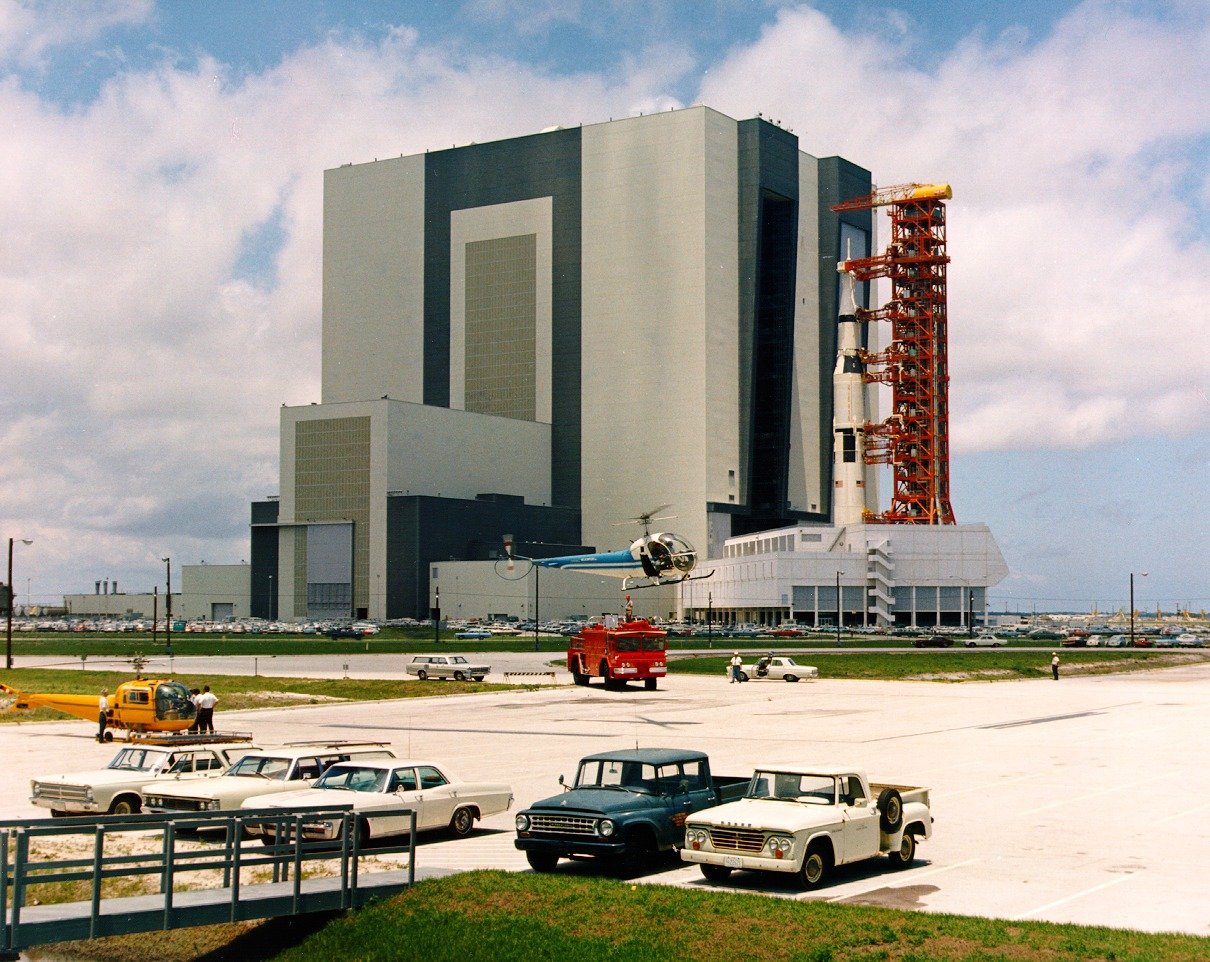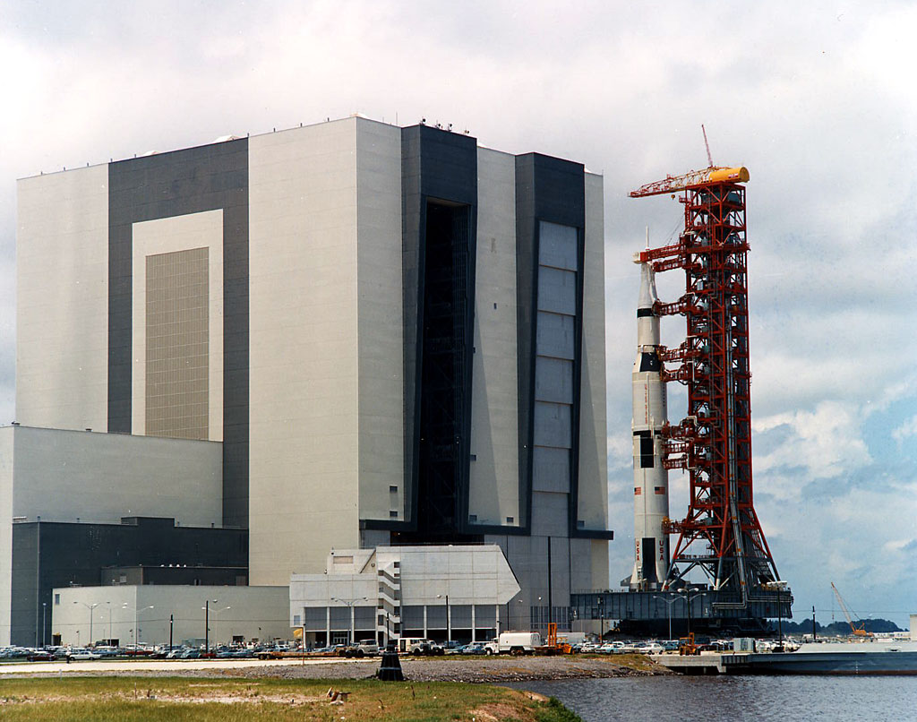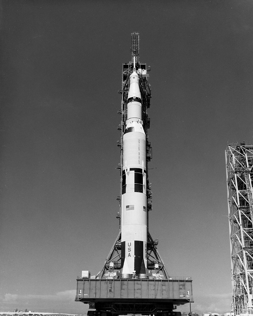 Mike Collins (holding the post) and Buzz Aldrin examine Columbia on the first anniversary of the Apollo 11 landing. Neil Armstrong may be the individual hidden by the post. Photo filed 20 July 1970. Scan by Frederic Artner.Launch Complex 39 (166k)
