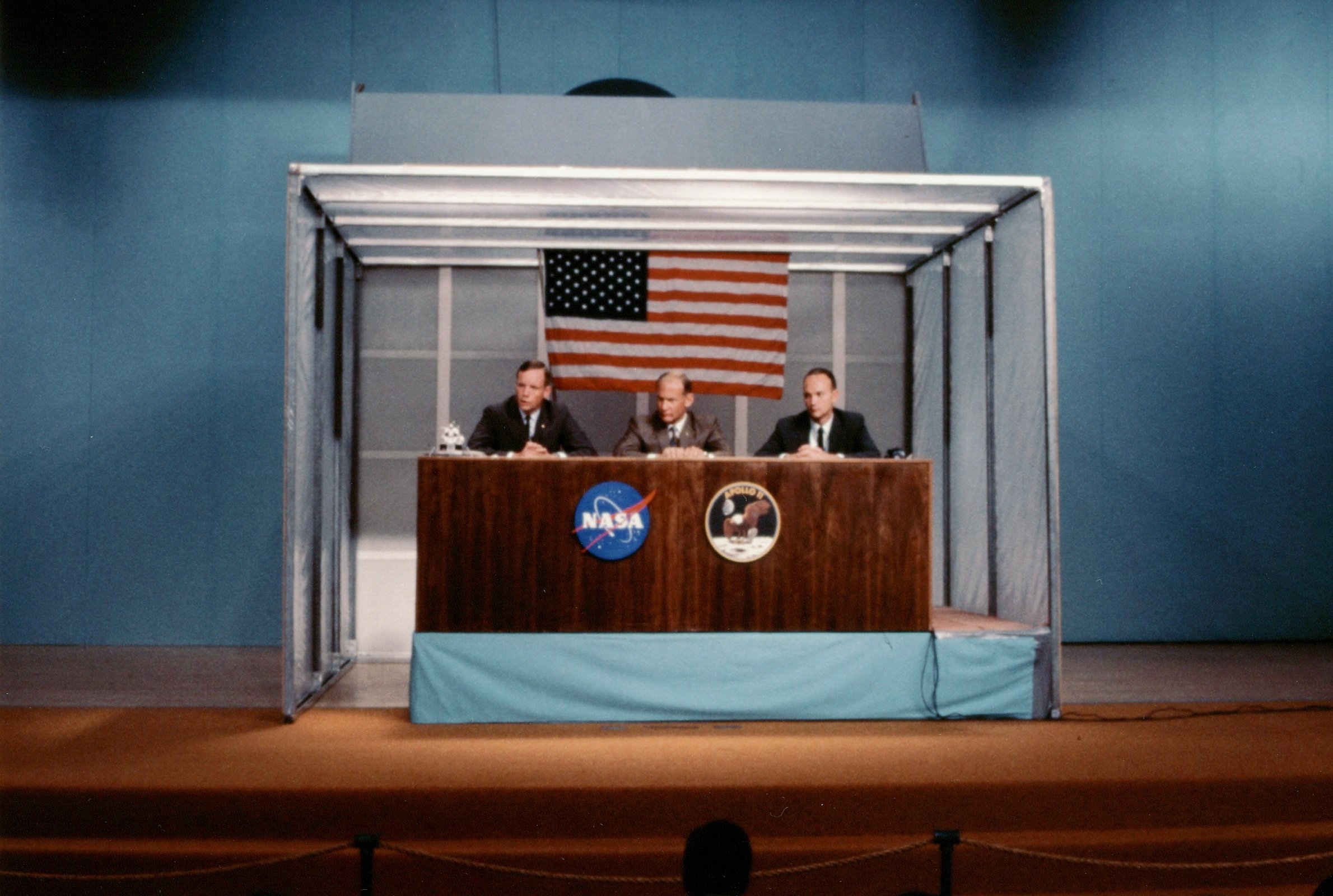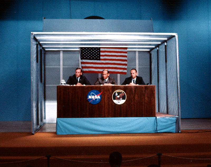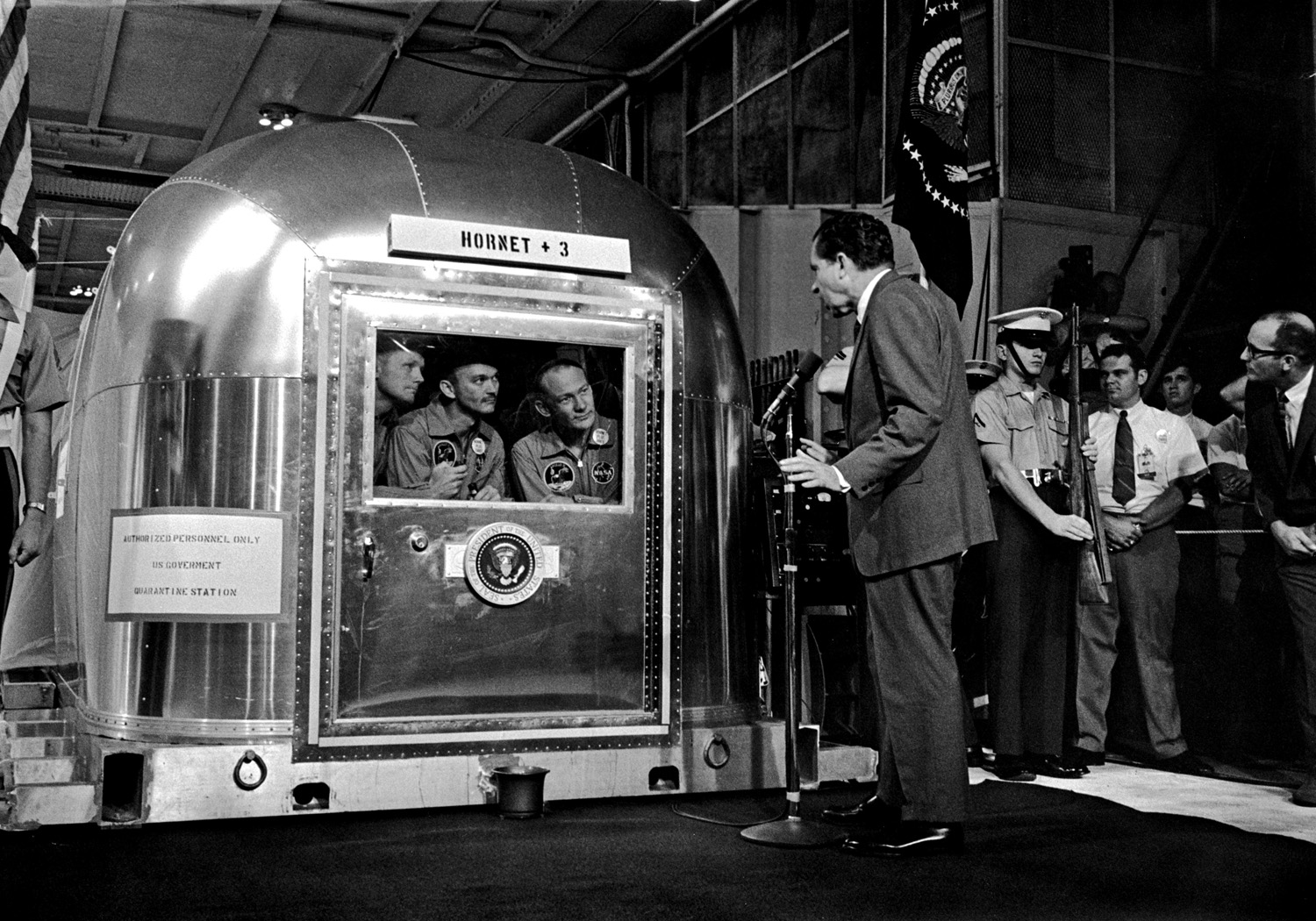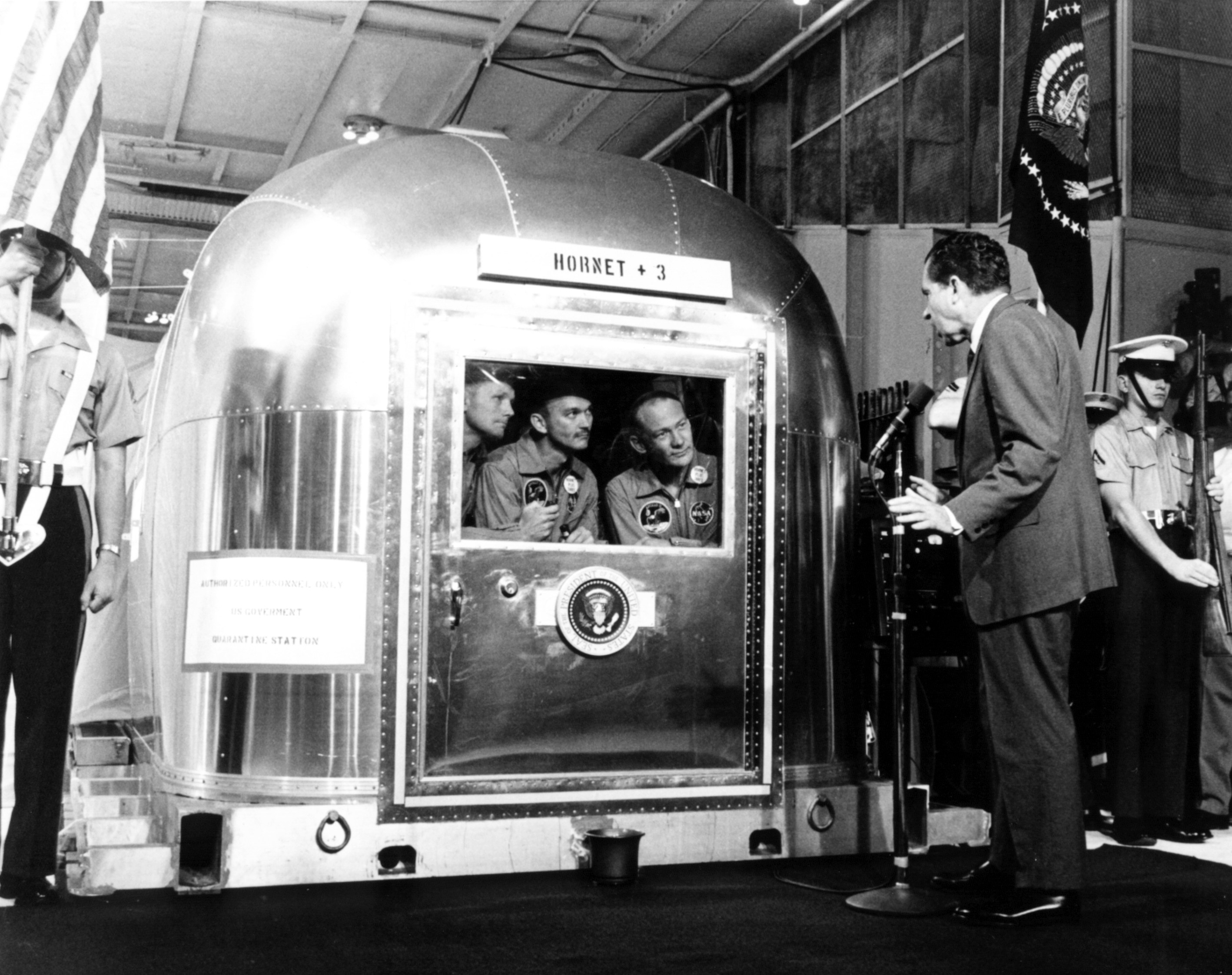 Armstrong, Collins, and Aldrin (left to right) in their Isolation van on-board the recovery ship U.S.S Hornet being greeted by U.S. President Richard M. Nixon. 24 July 1969. Scan by Kipp Teague.69-H-1196 ( 143k or 910k )