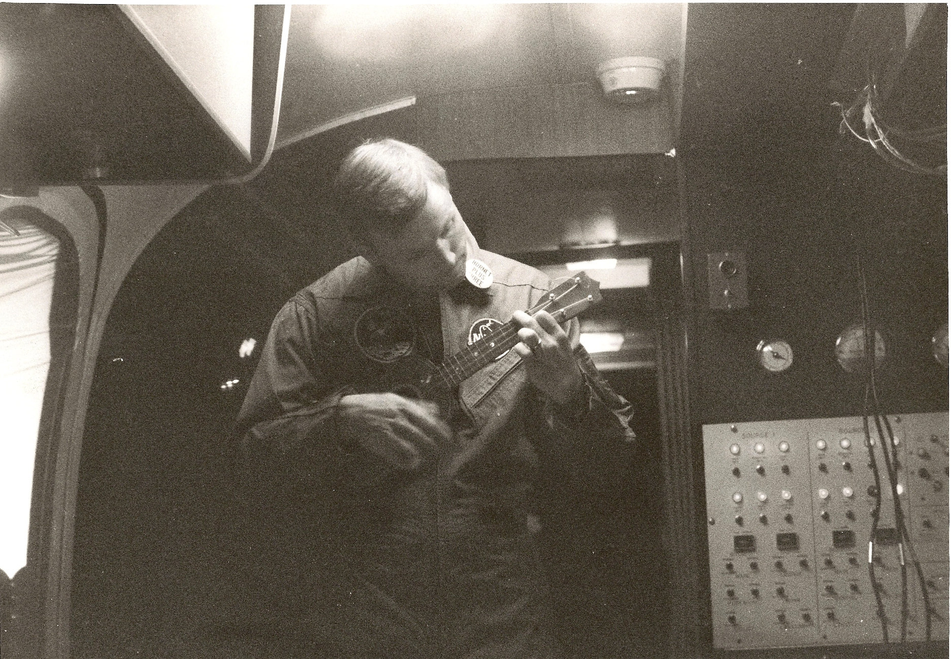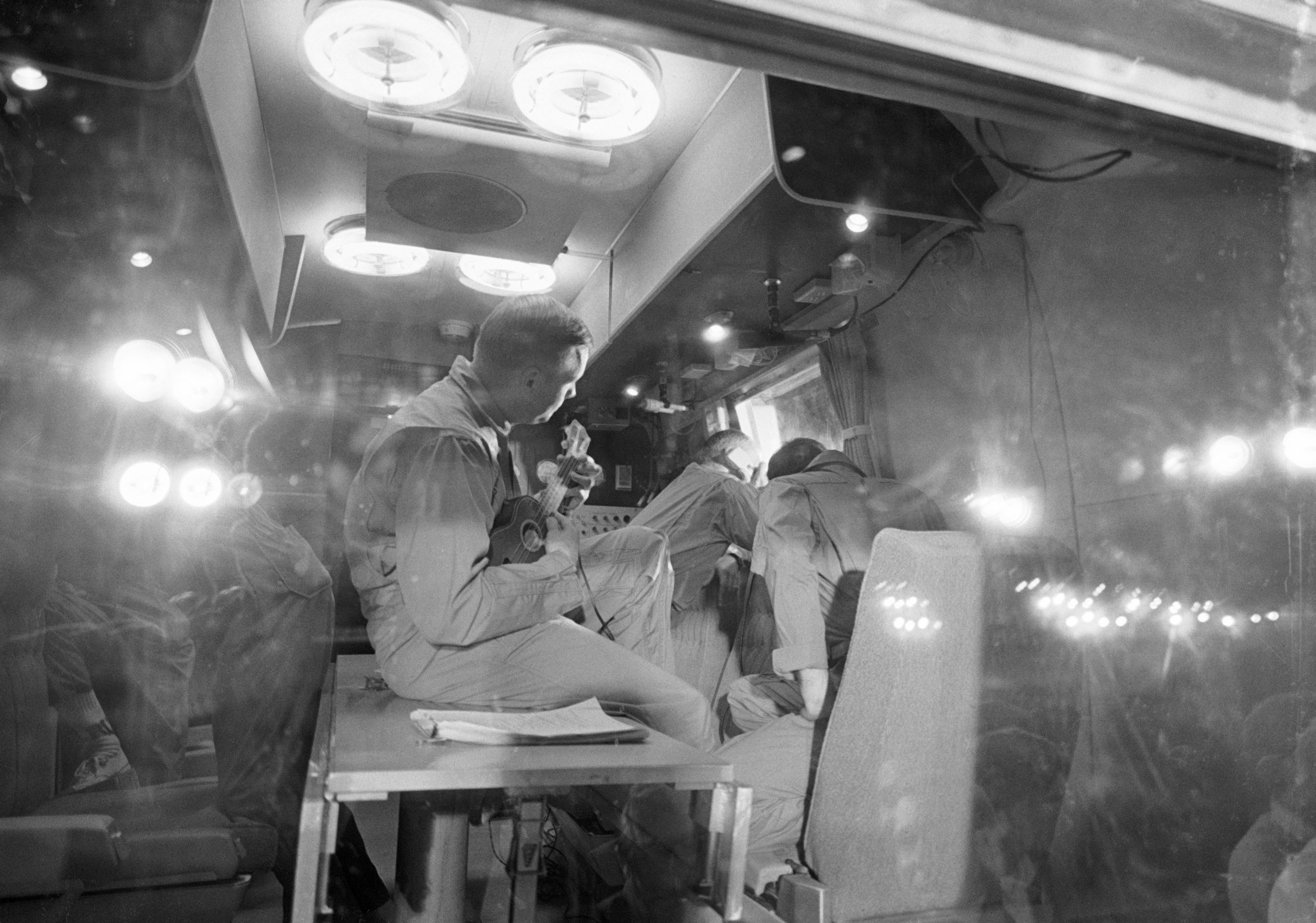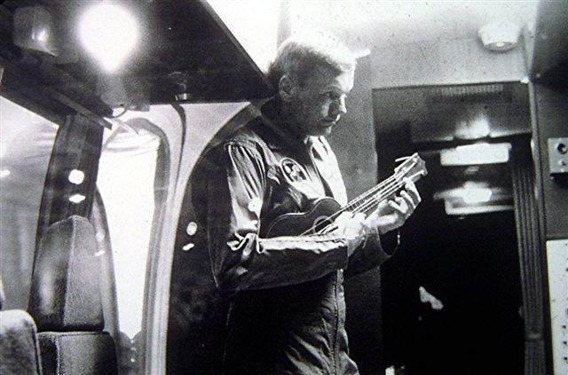 Neil relaxes in the MQF aboard USS Hornet, playing a ukulele. This photograph and the two following were taken by Don Blair, who covered five spacecraft recoveries for the Mutual (radio) Broadcasting System. He describes his experiences in a 2004 book Splashdown: NASA and the Navy. In brief, he took three shots from outside the MQF through the end window, at about 10 p.m. ship-board time on the night after the recovery. The only other person present outside the MQF was a young marine guard. Blair used a Canon F1 loaded with Kodak high-speed Tri-X black and white film. He took three "quick shots .. the other two were even less sharp than the one you're looking at." 24 July 1969. Scan courtsey Jody Russell/NASA Johnson.69-HC-840/69-H-1218 ( 1.3 Mb Color or 0.9 Mb )