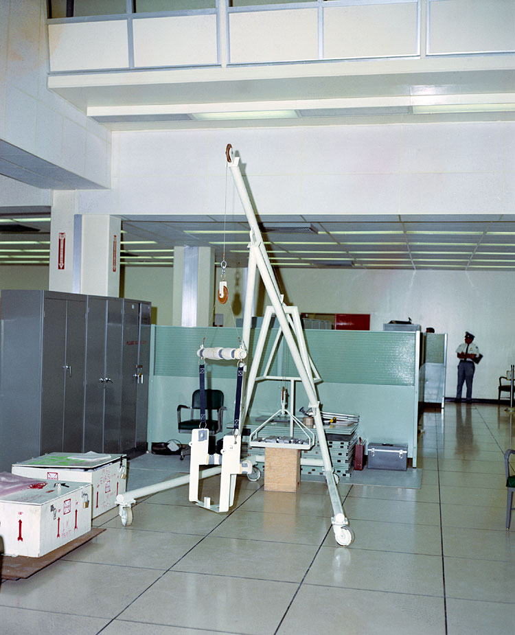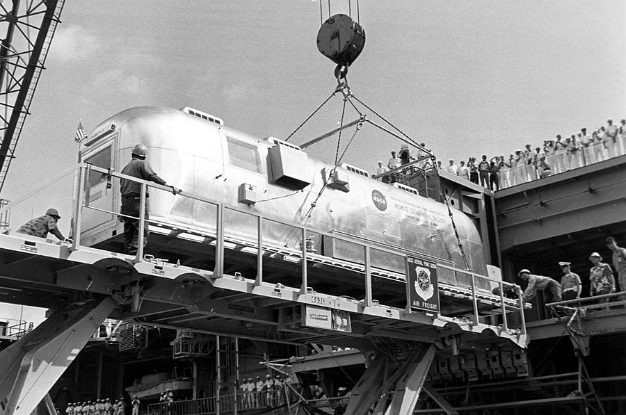 Offloading of the Mobile Quarantine Facility from the USS Hornet, to be sent to Hickam AFB, Hawaii. 26 July 1969. Scan by J.L. Pickering.S69-40147 ( 76k or 189k )