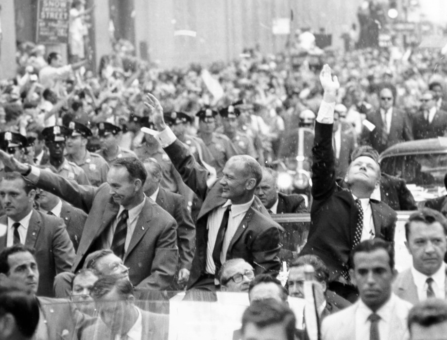 Collins, Aldrin, and Armstrong in post-flight tickertape parade in New York City. NASA Administrator Thomas Paine is seated in front of Buzz. Photo filed 13 August 1969. Scan by Kipp Teague.69-H-1426 ( 232k or 597k )
