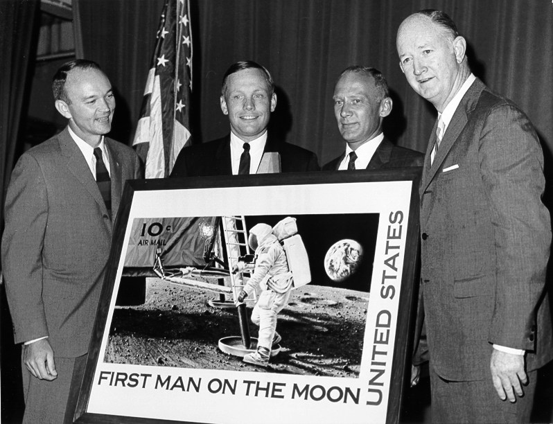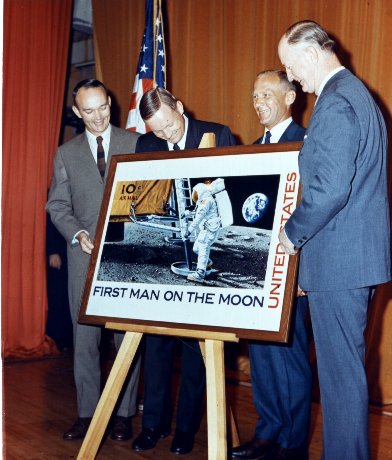 Collins, Armstrong, Aldrin with U.S. Postmaster General Winton M. Blount unveiling a stamp honoring Apollo 11. Photo filed 9 September 1969. Scan by Kipp Teague.69-HC-1119 ( 144k or 312k )