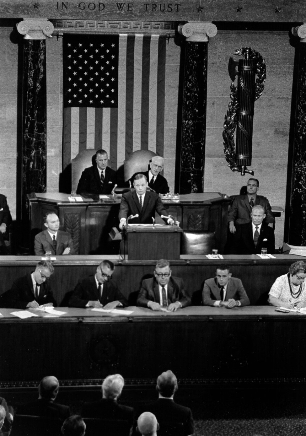 Armstrong, flanked by Collins (left) and Aldrin (right), address a joint session of Congress. Photo filed 16 September 1969. Scan by Kipp Teague.70-H-1567 (96k)
