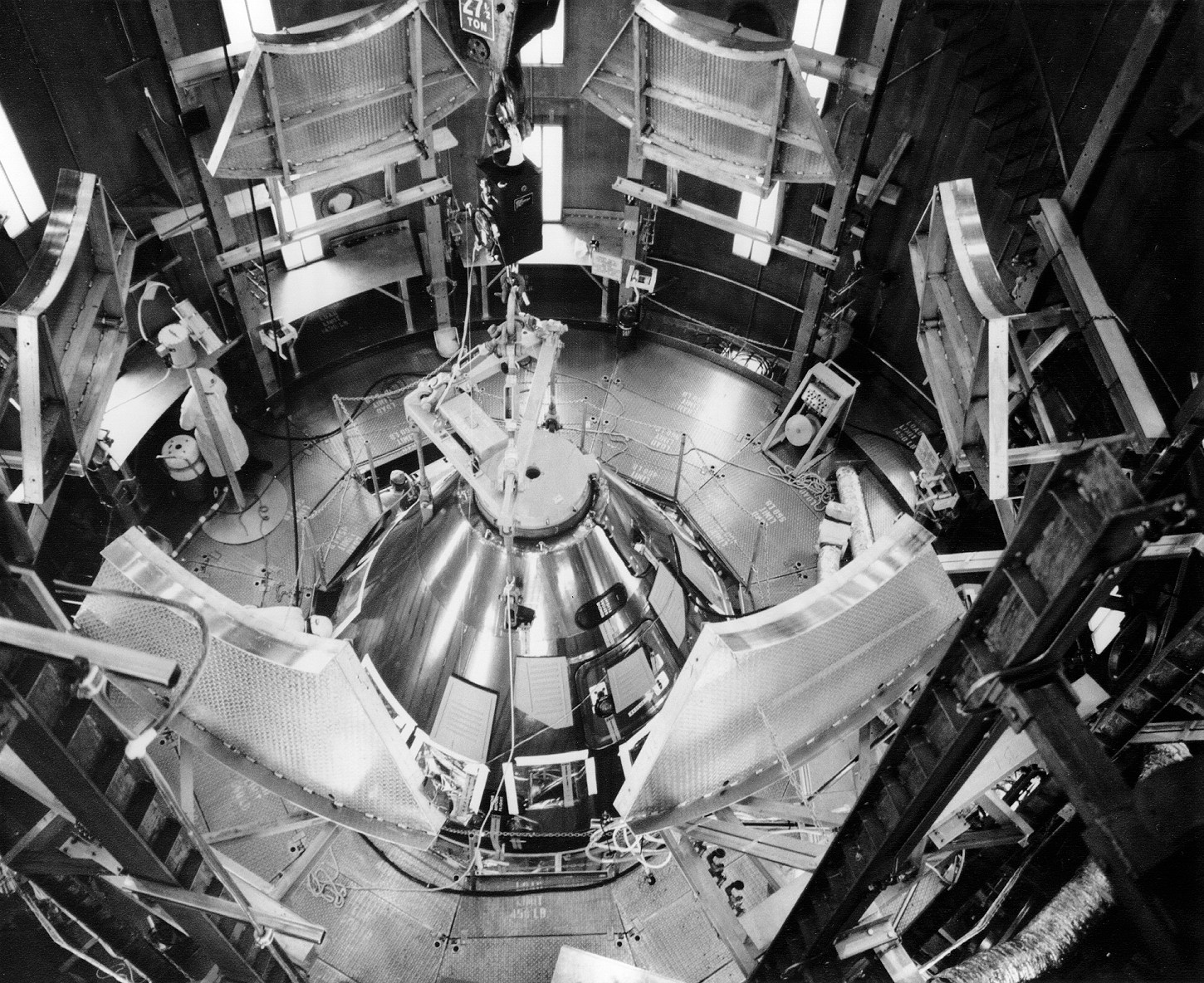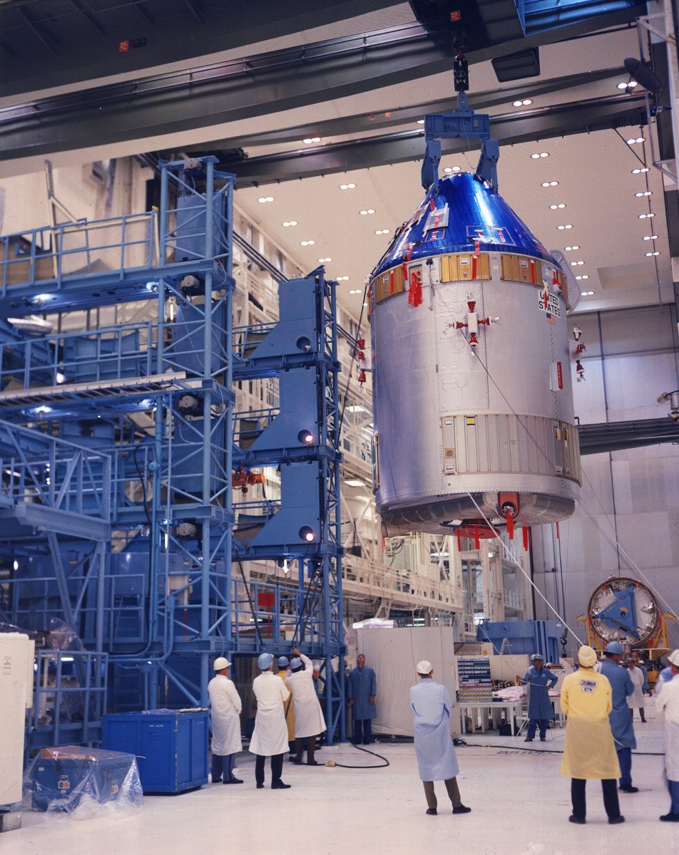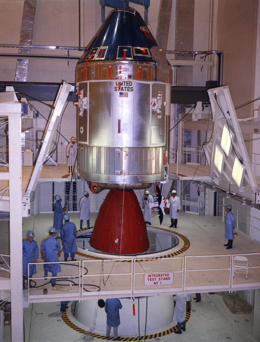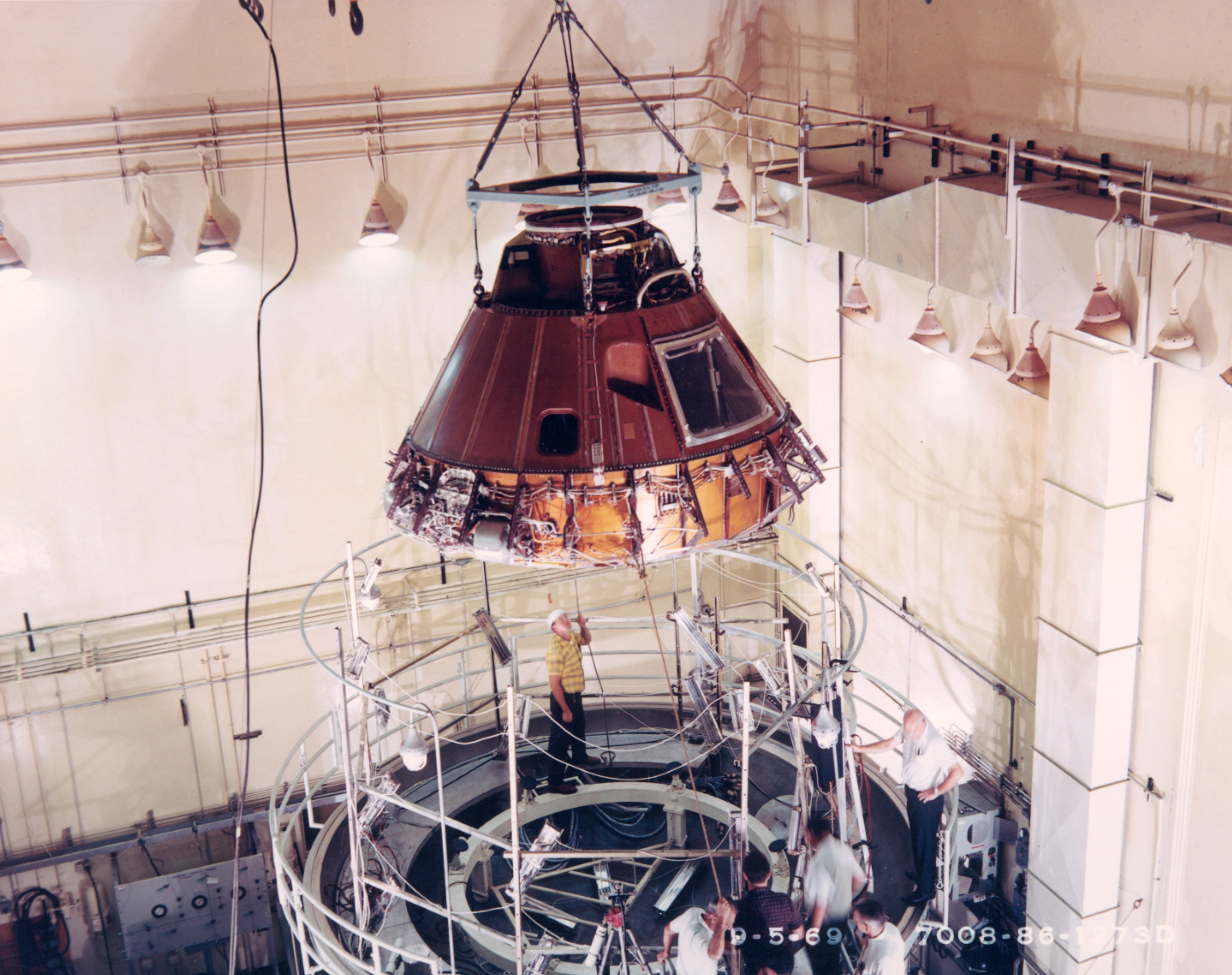 Apollo-11 command module is readied to undergo vacuum bake after return to Downey plant. This procedure would remove any residual moisture from splashdown before the CM was encased in plastic for display at the Smithsonian. 5 September 1969. Scan of Rockwell photo by Ed Hengeveld.69-H-1471 ( 128k )