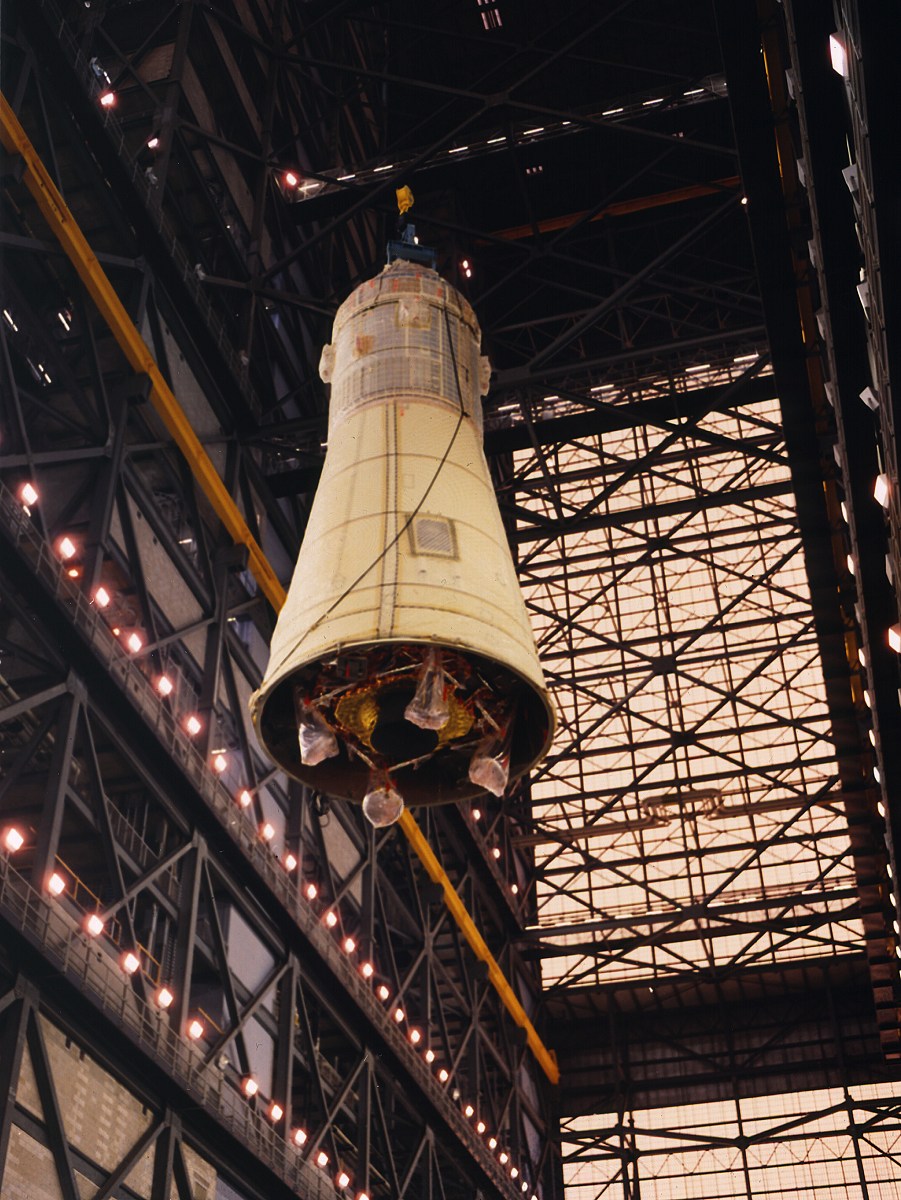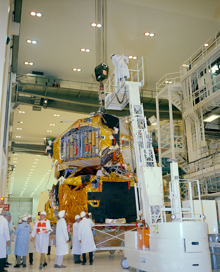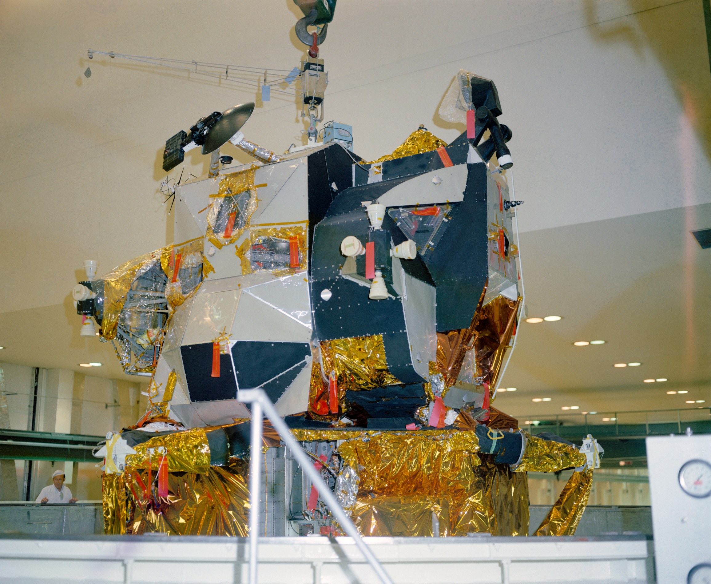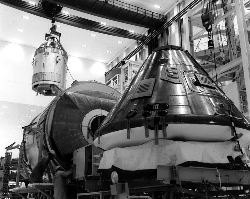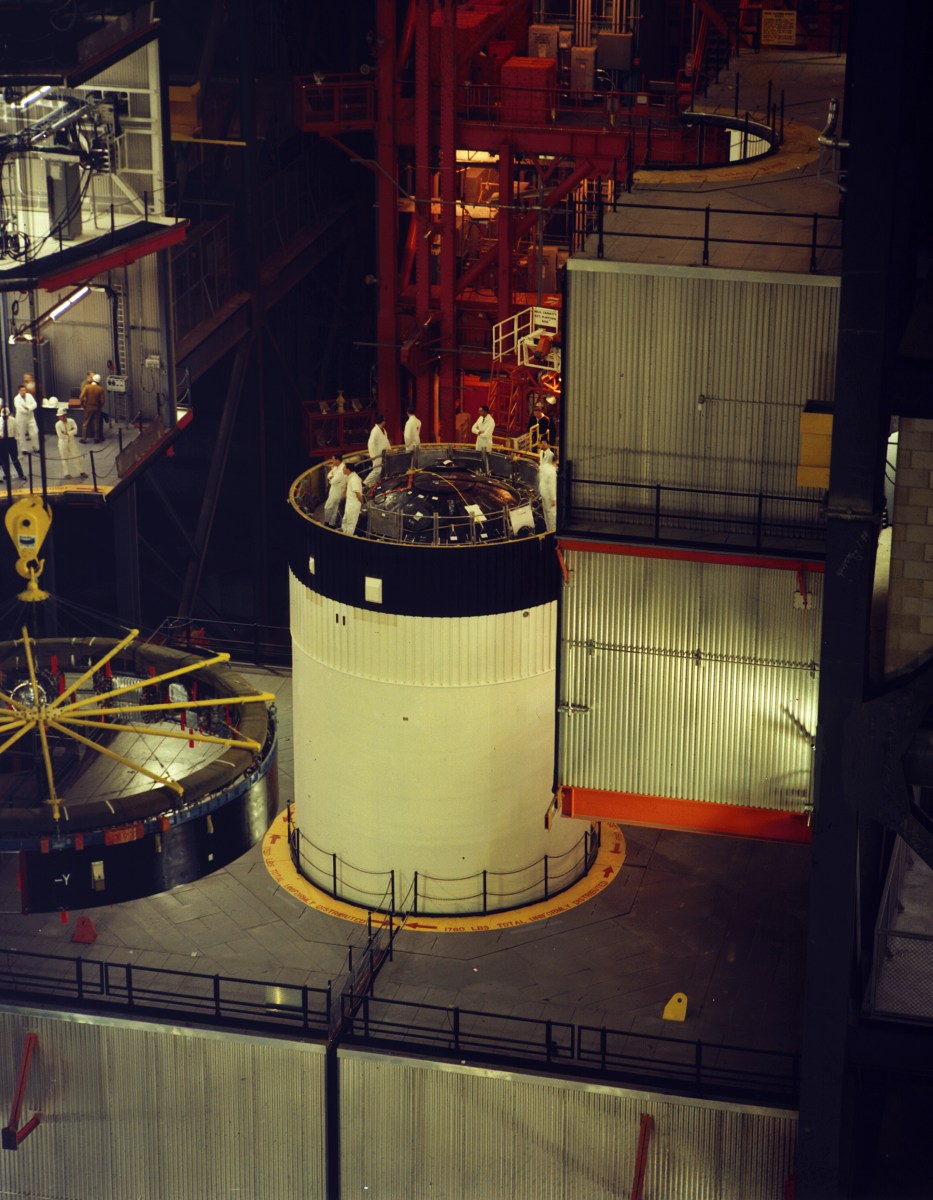 Apollo-11 command module is readied to undergo vacuum bake after return to Downey plant. This procedure would remove any residual moisture from splashdown before the CM was encased in plastic for display at the Smithsonian. 5 September 1969. Scan of Rockwell photo by Ed Hengeveld.69-H-1471 ( 128k )