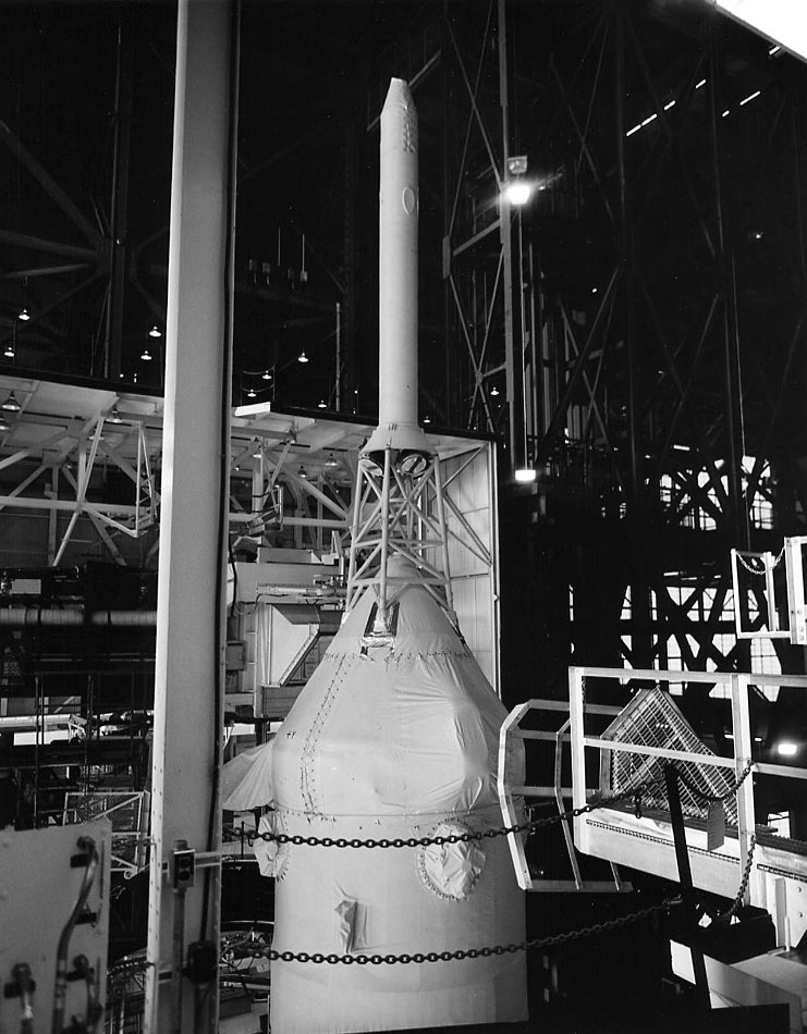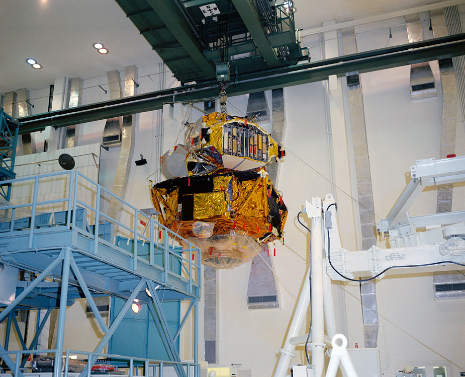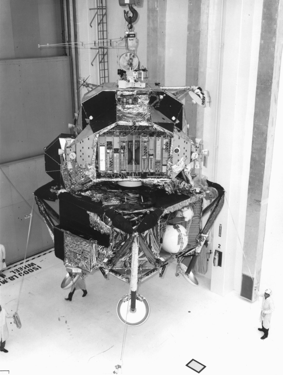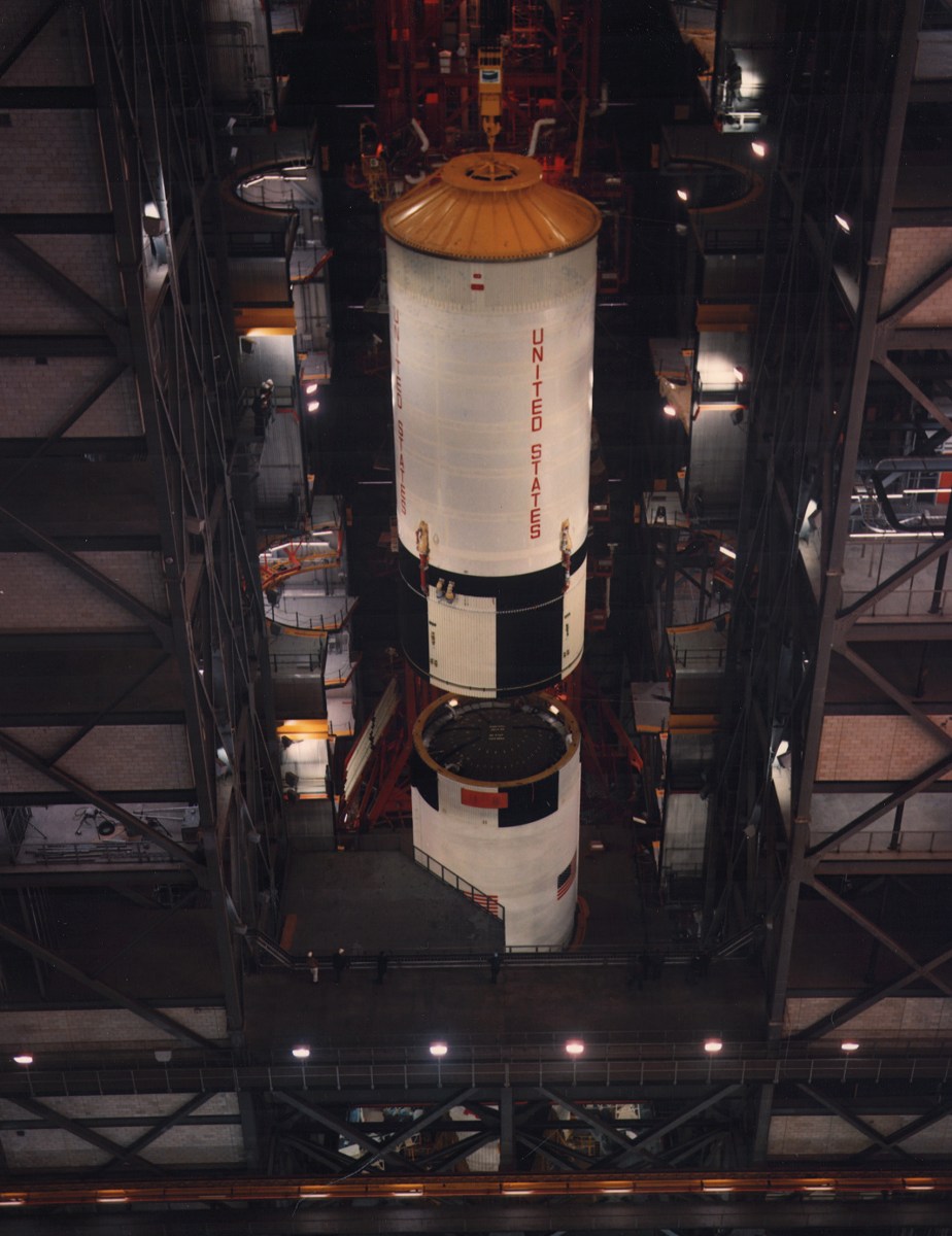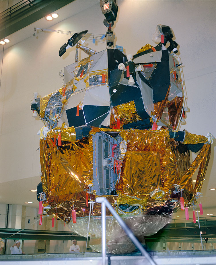 Apollo-11 command module is readied to undergo vacuum bake after return to Downey plant. This procedure would remove any residual moisture from splashdown before the CM was encased in plastic for display at the Smithsonian. 5 September 1969. Scan of Rockwell photo by Ed Hengeveld.69-H-1471 ( 128k )