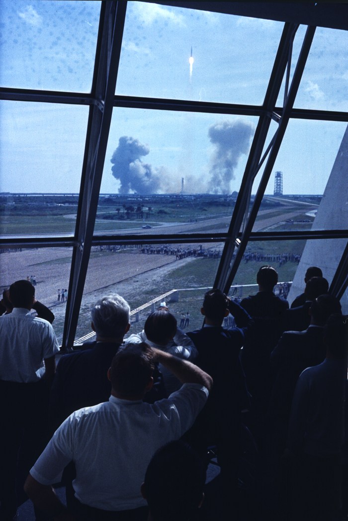 Armstrong, Collins, and Aldrin (left to right) in their Isolation van on-board the recovery ship U.S.S Hornet being greeted by U.S. President Richard M. Nixon. Photo filed 24 July 1969. Scan by Ed Hengeveld.KSC-69P-658 ( 0.6Mb or 3.9Mb )