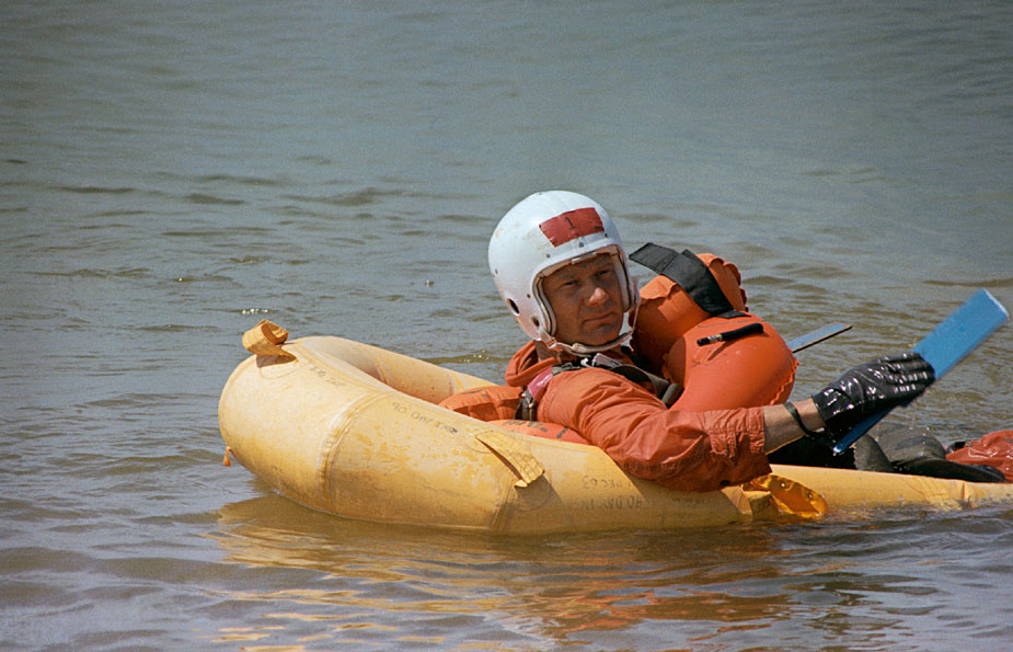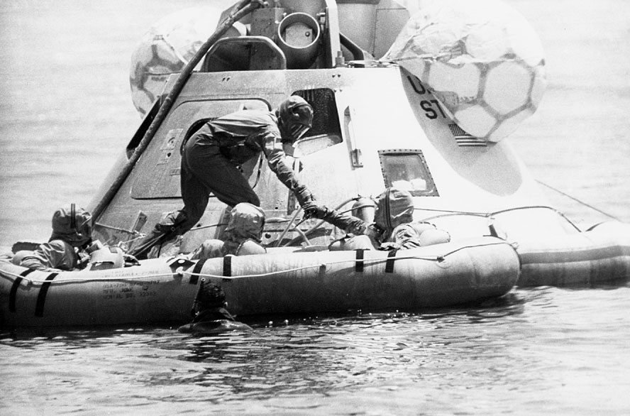 Apollo 11 crew and a Navy diver await pickup after splashdown. 24 July 1969. Scan by Kipp Teague.KSC-69PC-467 ( 236k or 510k )