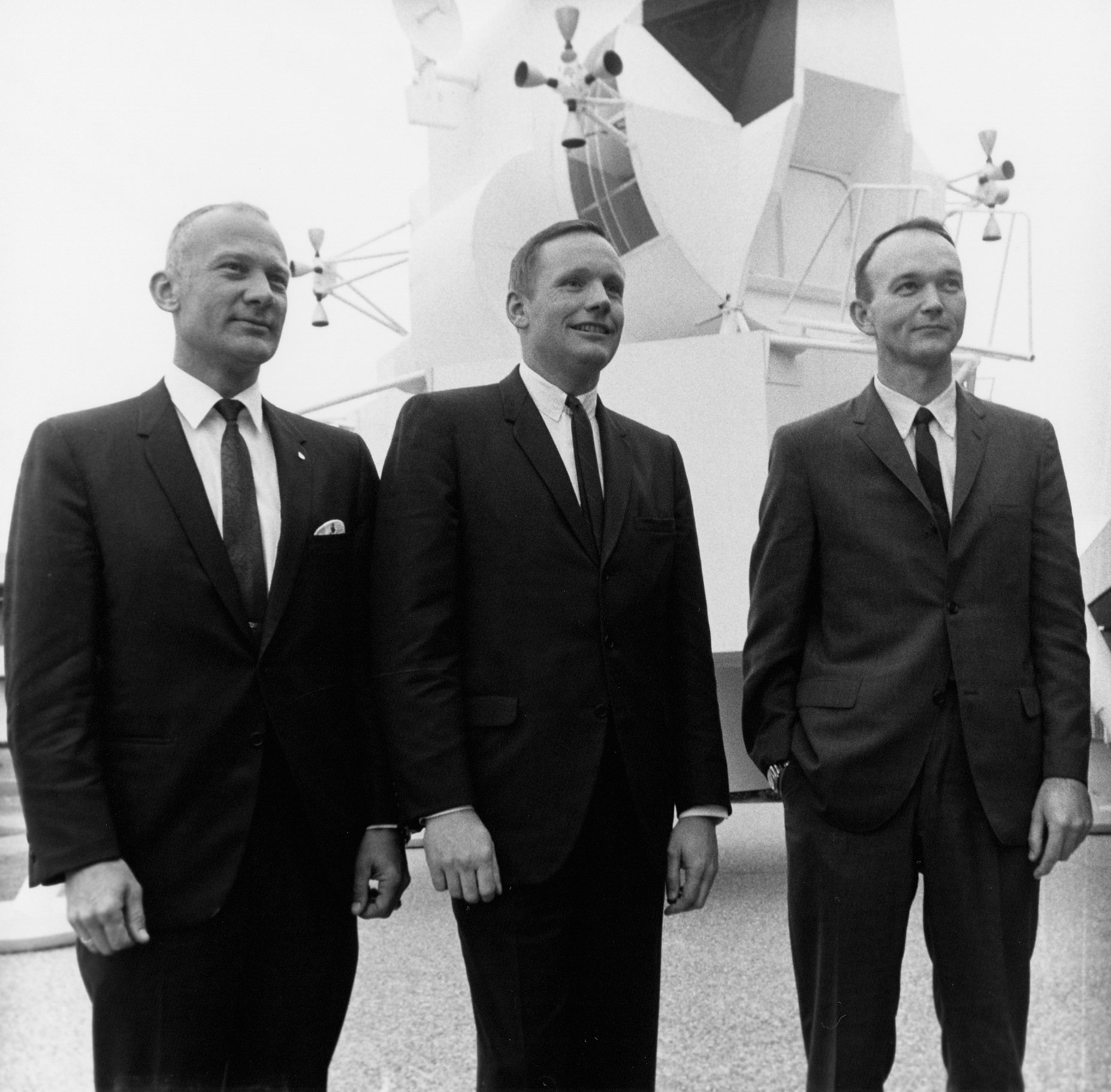 Mike Collins (left), Buzz Aldrin, and Neil Armstrong relax in the transfer van. 26 July 1969. Research by Jay Hanks.S69-21881 ( 196k or 778k )