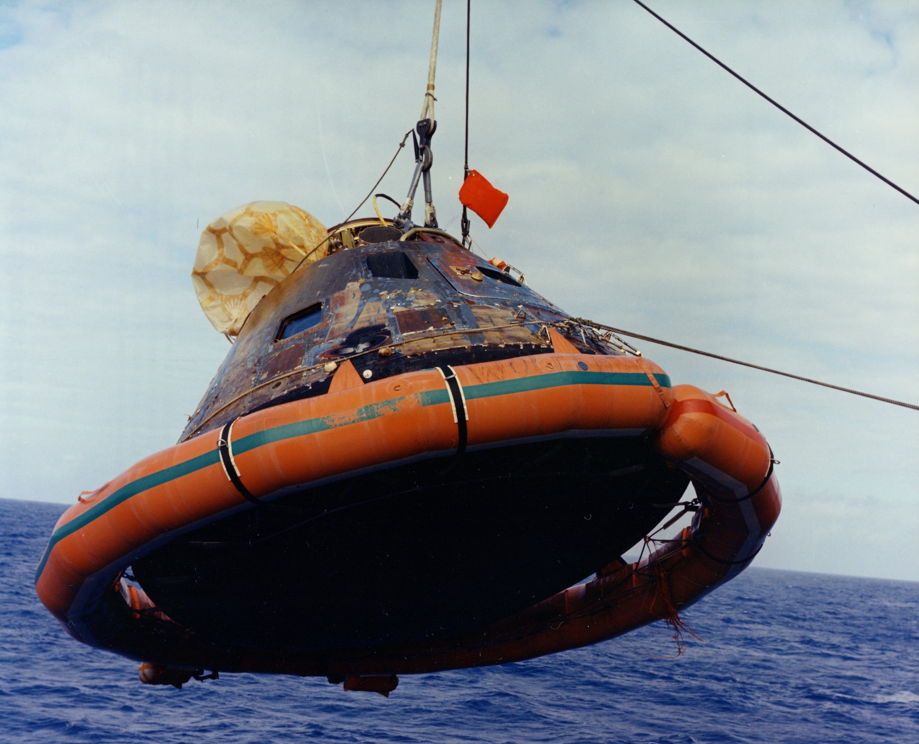 Apollo 11 Command Module during recovery operations. 24 July 1969. Scan by Kipp Teague.S69-21294 ( 185k or 972k )