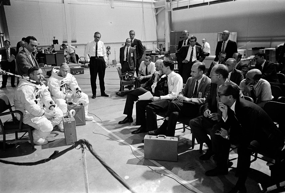 Aldrin, Collins, Armstrong (left to right), during a post-flight debriefing. Photo filed 3 August 1969. Scan by Kipp Teague.69-H-1247 ( 76k )