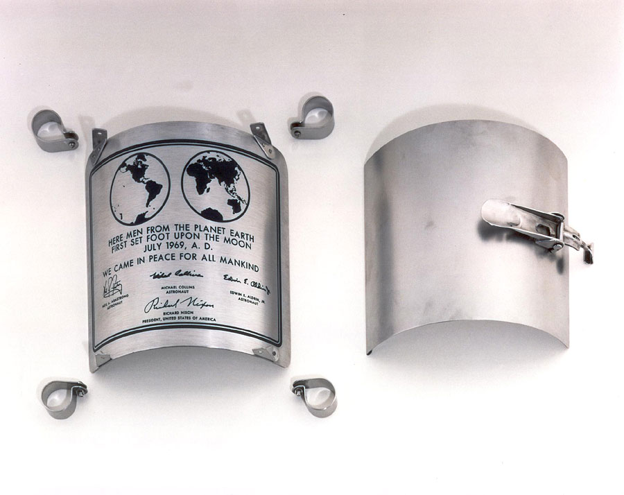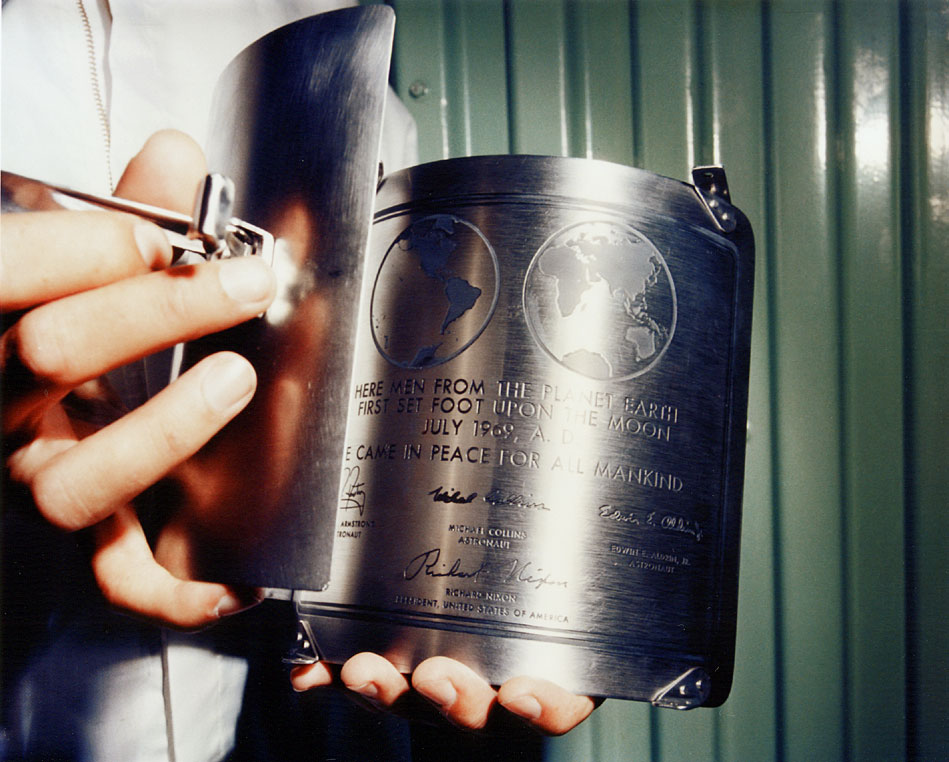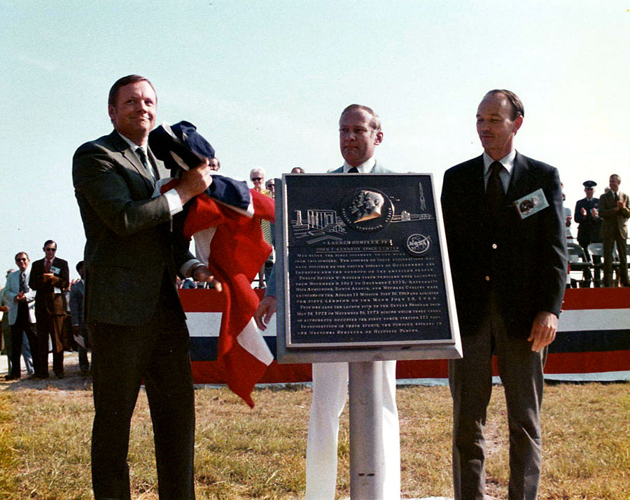 Armstrong, Aldrin, and Collins (left to right) unveil a plaque on designating Launch Complex 39 at the Cape as a site listed in the National Register of Historic Places. Photo filed 17 July 1974. Scan by Kipp Teague.S76-22598 ( 780k )