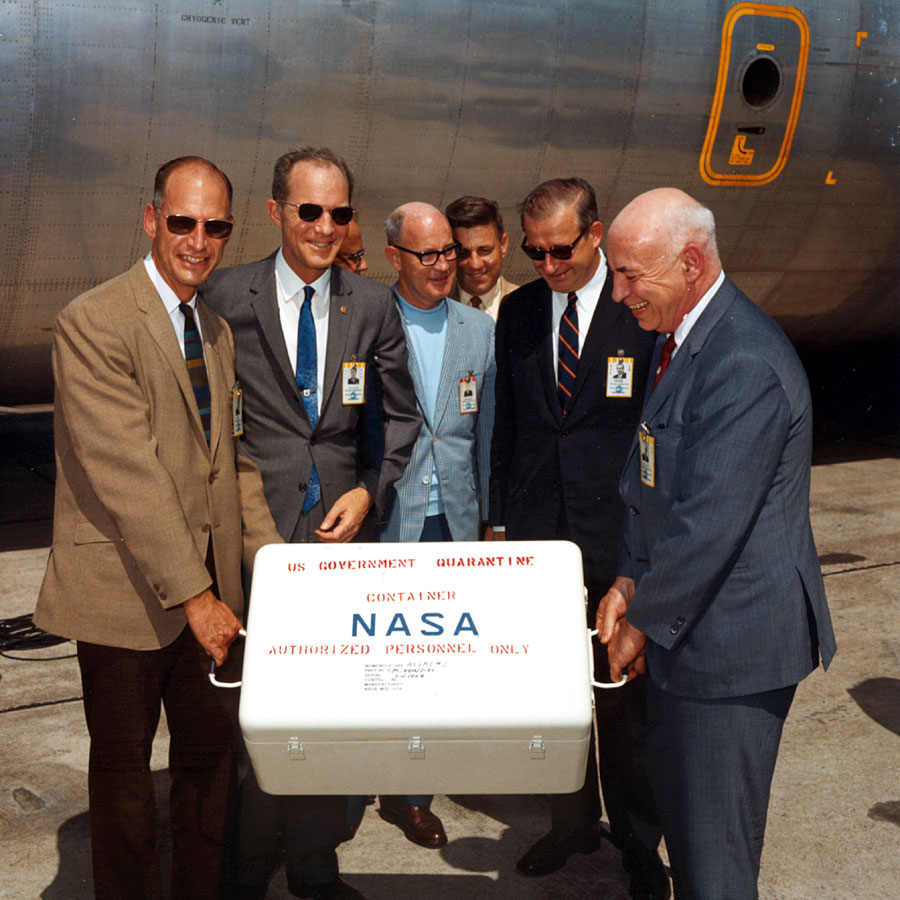 The first Apollo 11 sample return container, containing lunar surface material, arrives at Ellington Air Force Base by air from the Pacific recovery area. Happily posing for photographs with the rock box are (left to right) George M. Low, Manager, Apollo Spacecraft Program, Manned Spacecraft Center (MSC); U.S. Air Force Lt. Gen. Samuel C. Phillips, Apollo Program Director, Office of Manned Space Flight, NASA HQ.; George S. Trimble, MSC Deputy Director (almost obscured); Eugene G. Edmonds, MSC Photographic Technology Laboratory; Richard S. Johnston, M.D. (in back), Special Assistant to the MSC Director; Dr. Thomas O. Paine, NASA Administrator; and Dr. Robert R. Gilruth, MSC Director. Caption courtesy of Mike Gentry, JSC Media Services, who writes " This was one of the first captions I wrote when I joined MSC in 1969." 25 July 1969. Scan by Ed Hengeveld.S69-39996 ( 199k or 796k )