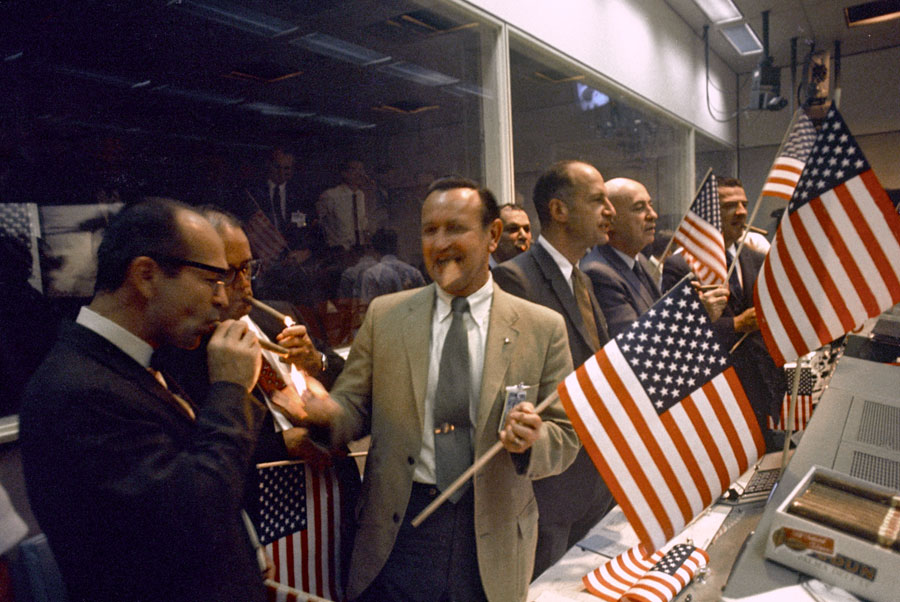 Mission Control in Houston celebrates after splashdown. 24 July 1969. Scan by Kipp Teague.S69-40024 ( 144k or 429k )