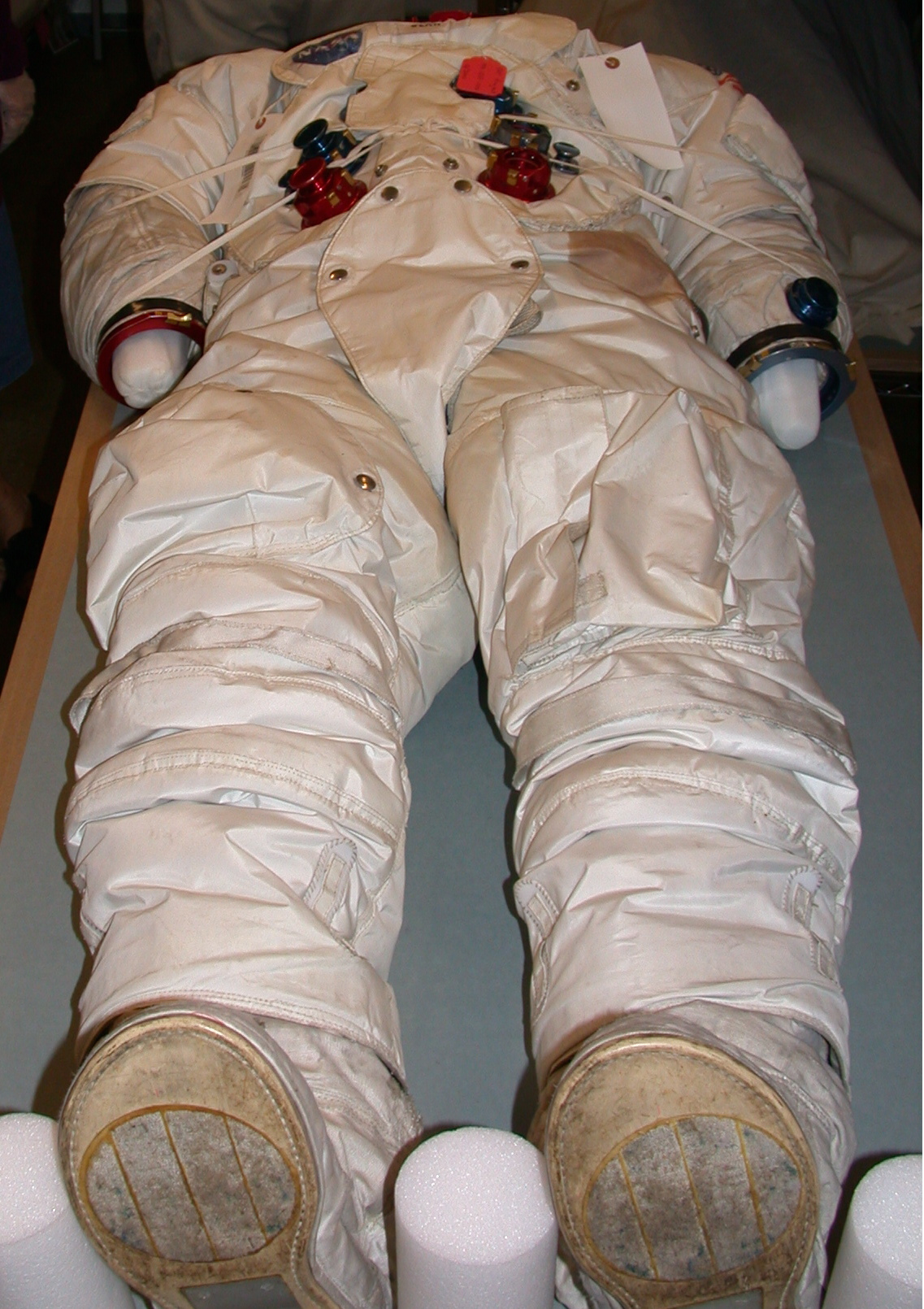 Ulli writes "Note that the Integrated Thermal Micrometeroid Garment (ITMG) of Al's suit was removed for post-flight analysis in late Januray 1970. The objective was to provide information on degradation of materials after an actual mission exposure.