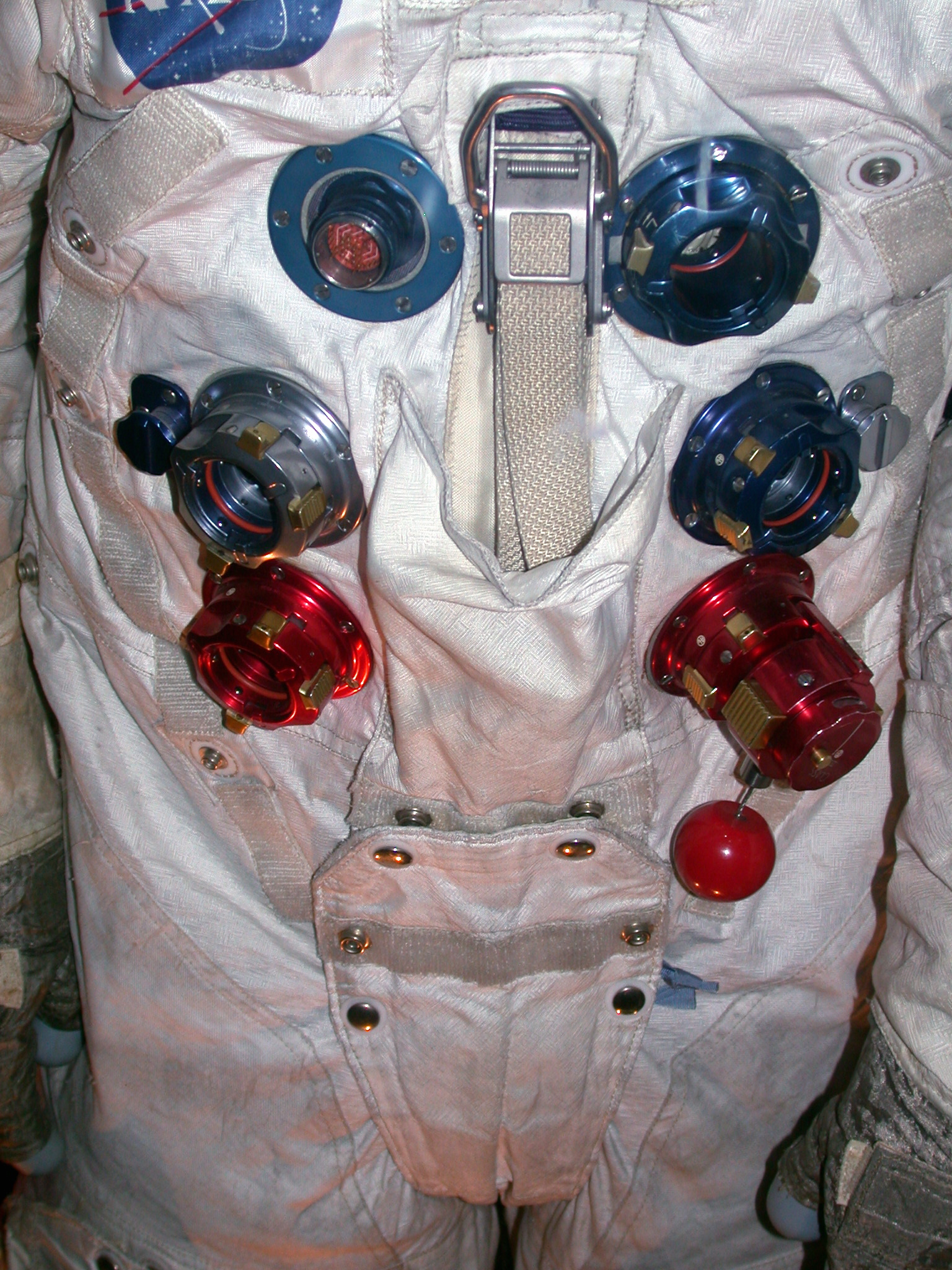 - Detail of the connector from the left. The PLSS upper attachment bracket is immediately to the wearer's left of the electrical connector, with the neckring tiedown / torso adjustment strap hanging below, The blue PLSS/LCG water connector is beyond the strap.