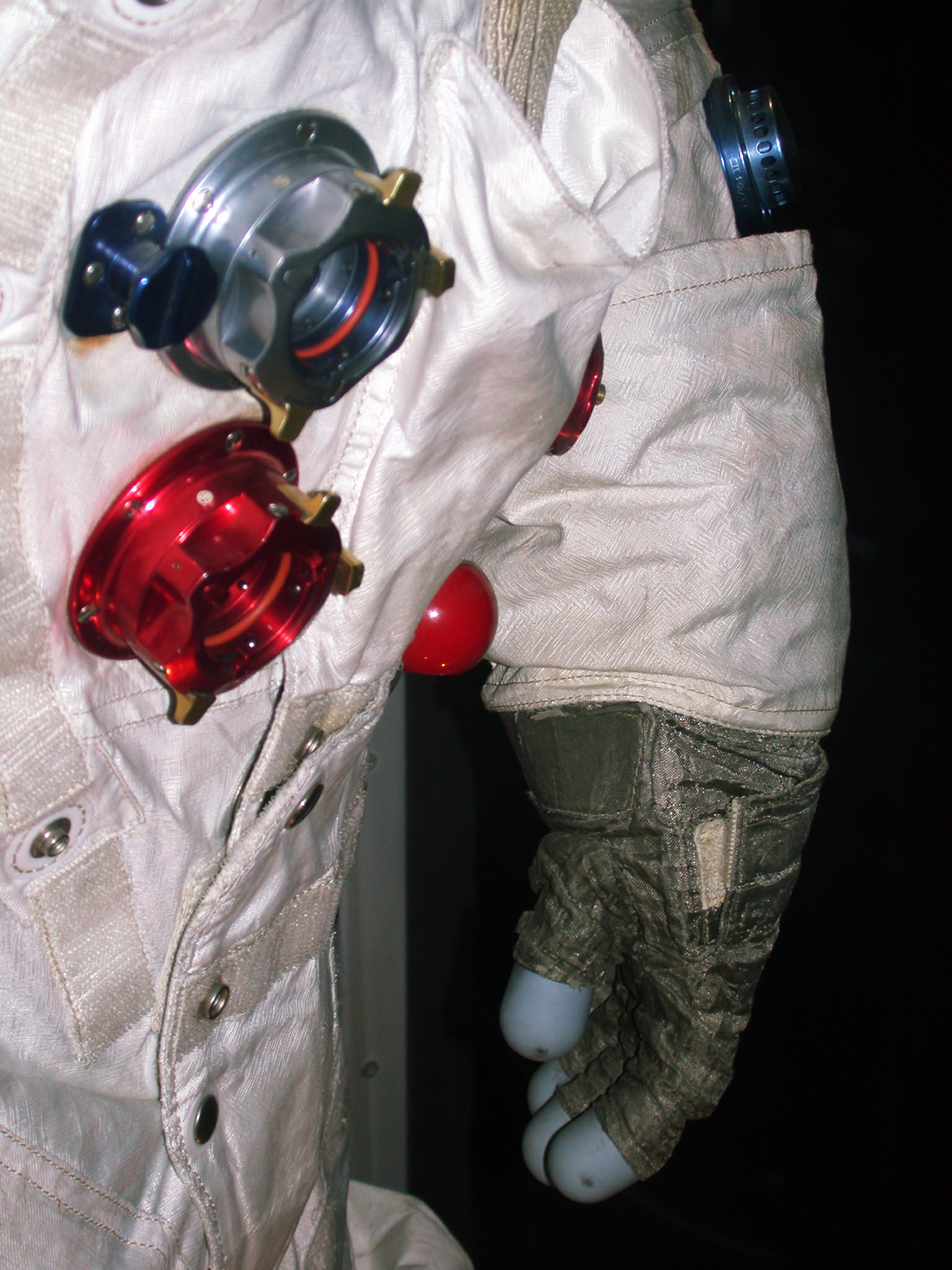 - View from the right of a left glove, but not the one worn during the mission. In the foreground are the red gas outflow connector where the Purge Valve was normally installed and, above it, the blue gas inflow connector where the OPS O2 hose was attached. We have a side view of the pressure relief valve just above the gauntlet.