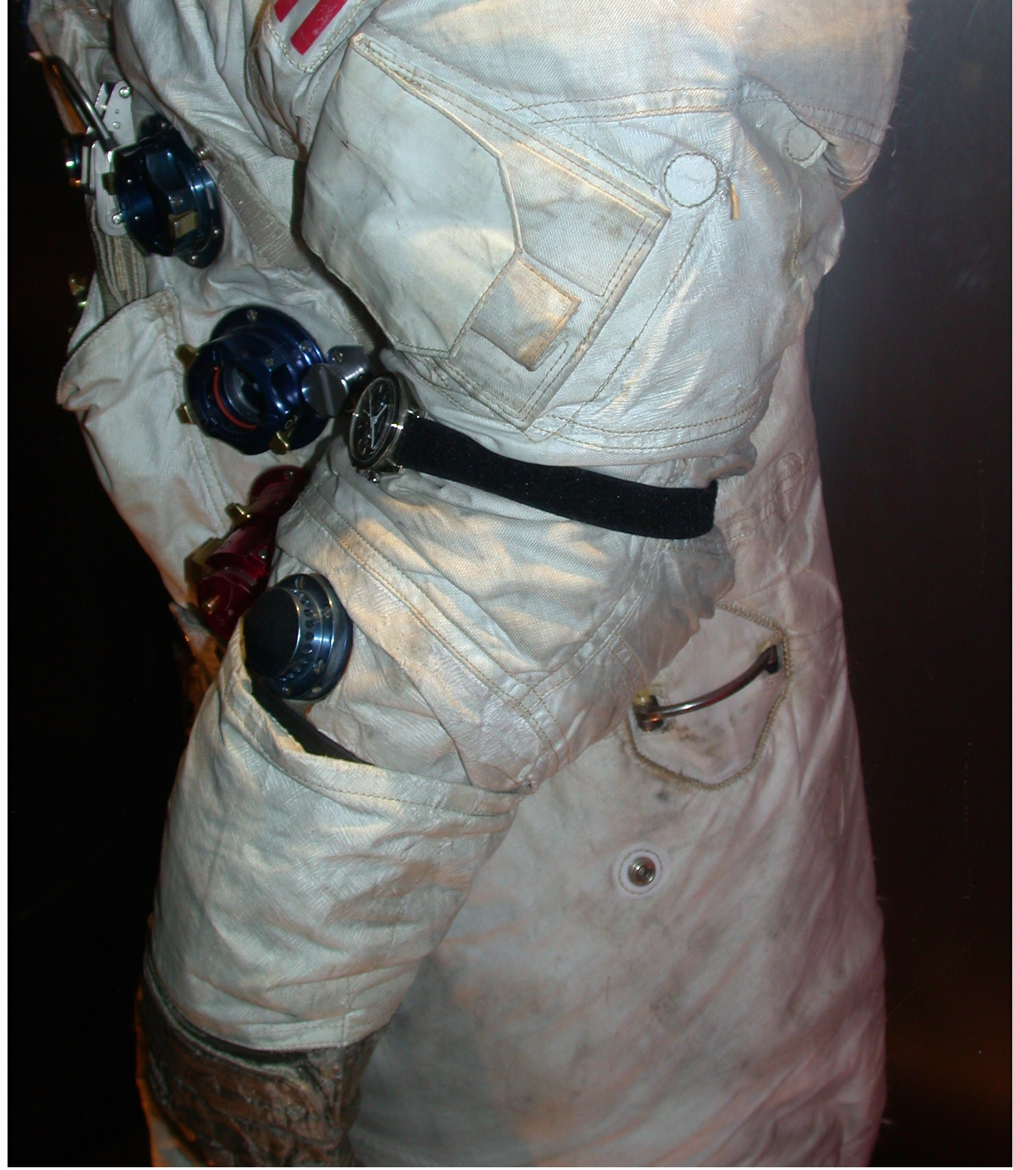 - This view shows the waist tether connection on the wearer's left hip, a watch - not the flown article - strapped to the arm just above the elbow, a shoulder pocket just above the watch, the pressure relief valve just above the gauntlet, and the left-side connectors beyond the arm.