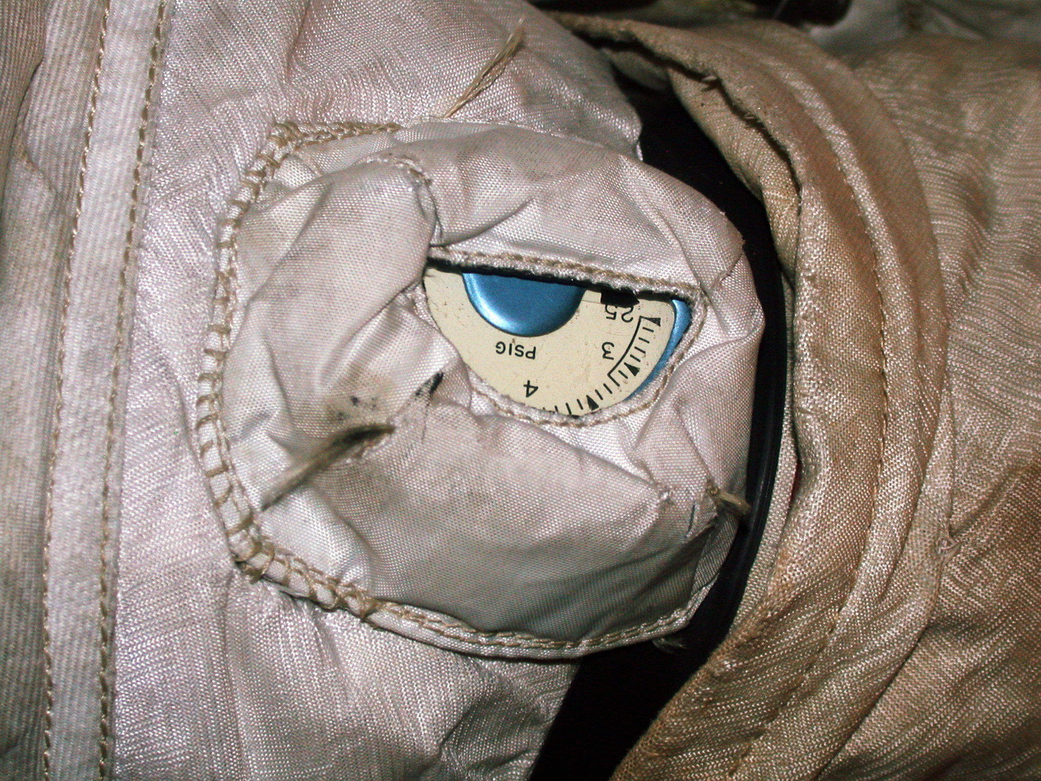 - Close-up. The gauge registered internal suit pressures above 2.5 psi in increments of 0.1 psi. Because the displayed suit in not pressurized, the gauge indicator is pegged just below 2.5 psi. The gauge was on the right arm just above the glove connector. In this image, the center line of the torso is up and the glove is to the right. When the astronaut bends his arm inward, he sees the gauge in normal orientation for reading.