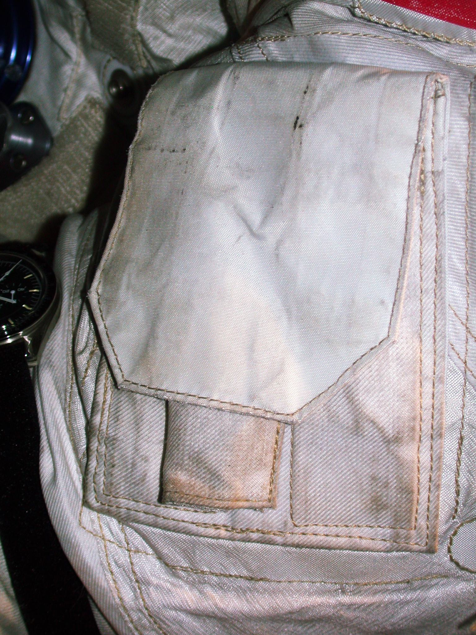 - The flap on this larger pocket opens upward. The non-flown watch displayed on this suit is on the lefthand edge of the picture.