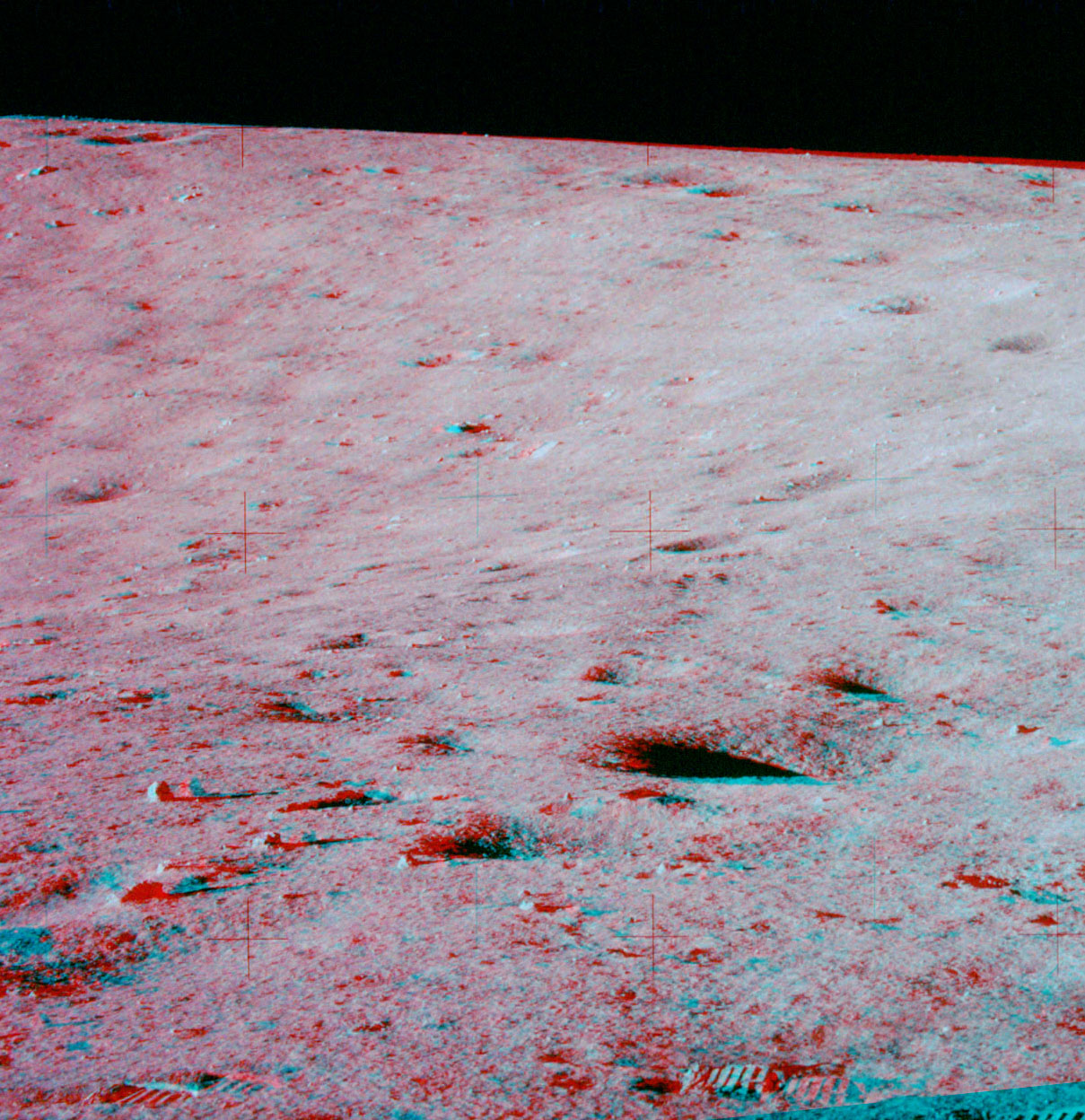 This frame is part of the re-do of the 8 0'clock pan Al did at the end of EVA-1. We are looking south along inner, west wall of Surveyor Crater.