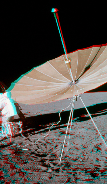 Although the LM had an S-band antenna for communications with Earth, it was inadequate for the job of sending TV signals. Early in EVA-1, Pete and Al erected this far larger antenna for that purpose.