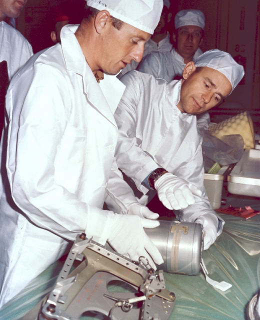 [NASA photo S69-34035 shows Pete Conrad and Al Bean examining the Passive Seismometer prior to the flight. The fact that they are wearing white gloves, caps, etc suggests that this is the flight hardware and that it wasn't only the white-painted objects that were handled with great care pior to the flight. The object in the foreground is the folded-up Hand Tool Carrier (HTC).]117:03:25 Conrad: I got a kind of a problem here. (Pause) I'm going to have to do this myself. I'll have to do this backwards; but it's going to work right. (Pause) Oops. (Pause)[Bean, from the 1969 Technical Debrief - "I think we're kidding ourselves if we think there is any way to deploy this experiment (that is, the ALSEP) without getting a lot of dirt and dust on it. The pictures are going to show this. They just have to be designed to accept dirt and dust. If they can't accept the dirt and dust, then they are going to have to be packaged in some way so they can be deployed completely and then, the last act would be to pull some sort of pin and flip off the covering that would have all the dirt and dust on it, exposing the nice clean experiment."]