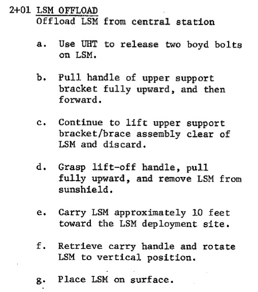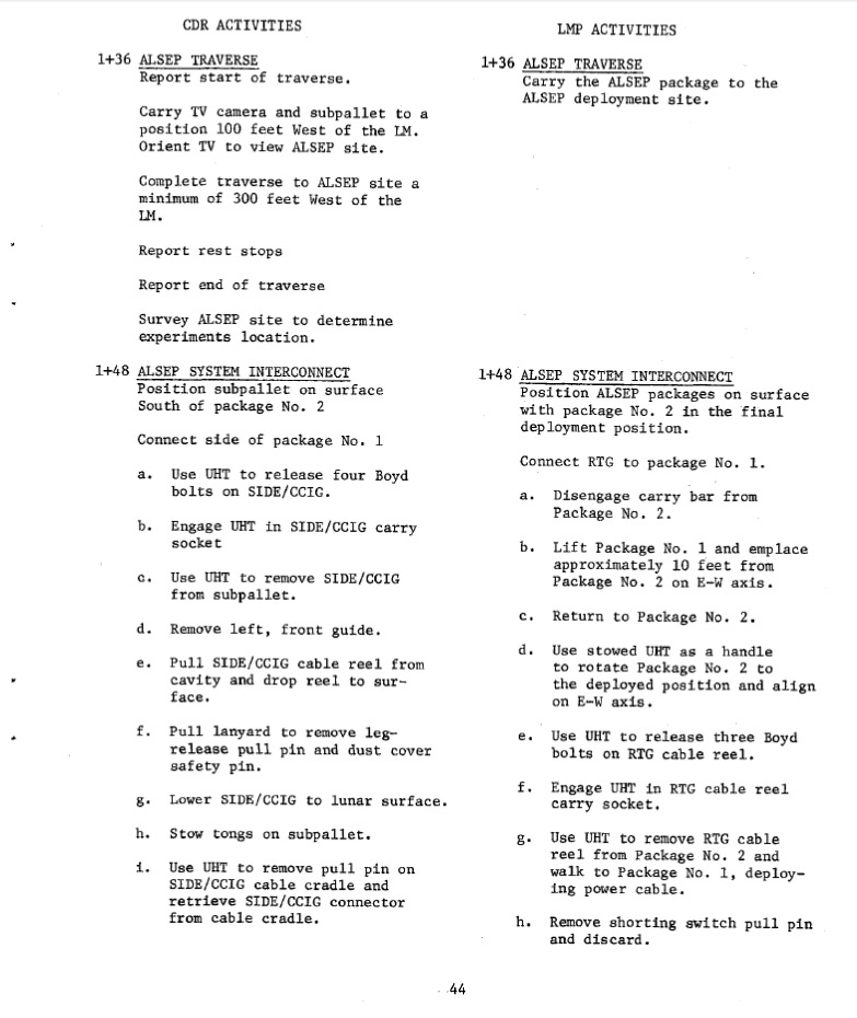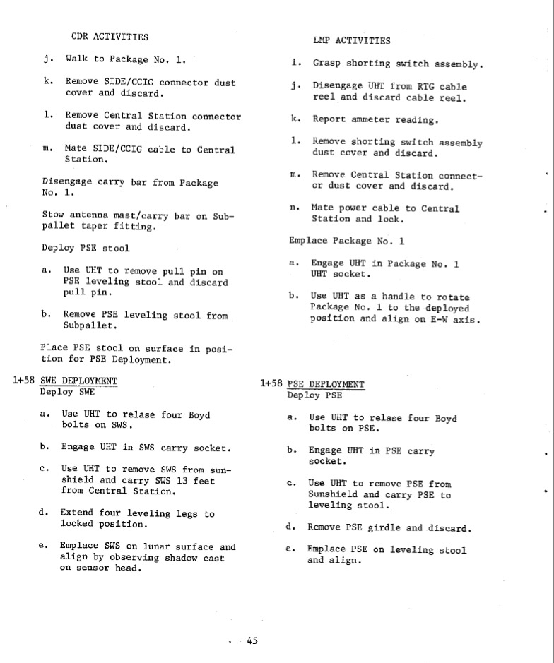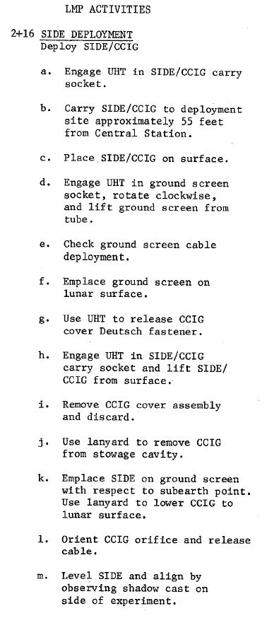 [Once he gets the SIDE free, Pete will extract the cable reel (step 'e' on page 44), deploy the legs (step 'f') which will keep the experiment off the ground, put the SIDE down on its legs (step 'g'), stow his tongs on the subpallet (step 'h'), and connect the experiment cable to the Central Station (steps 'i' to 'm'). In the meantime, Al will position the RTG.]
