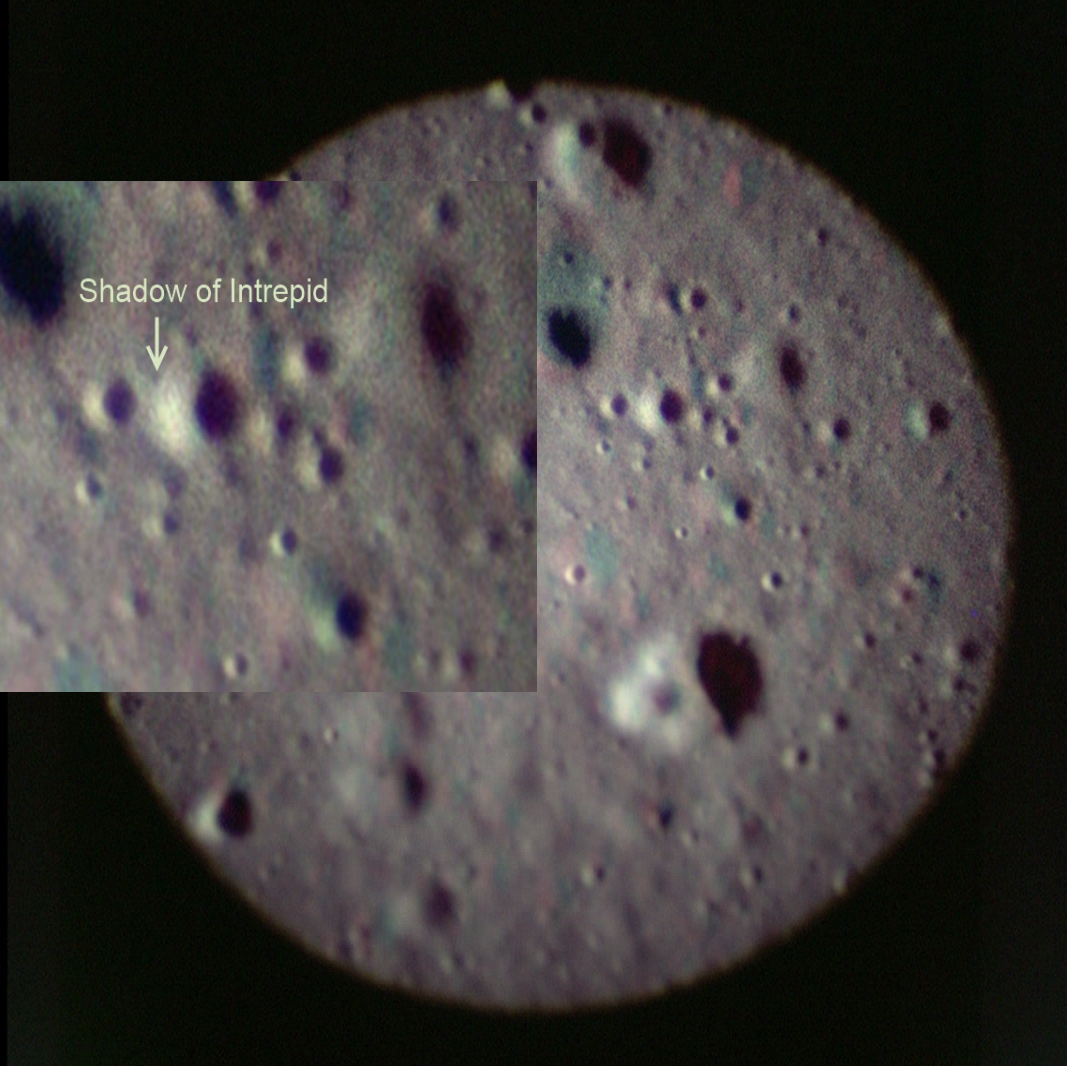 [Here, Dick means that, if one imagines the Snowman lying face up on the lunar surface, with his legs extending east, Intrepid is on the Snowman's left (north) shoulder.]114:25:04 Gordon: He (Pete Conrad) is about a third of the way from the Surveyor Crater to the Head. (Sounding very pleased with himself) I see Surveyor! I see Surveyor!