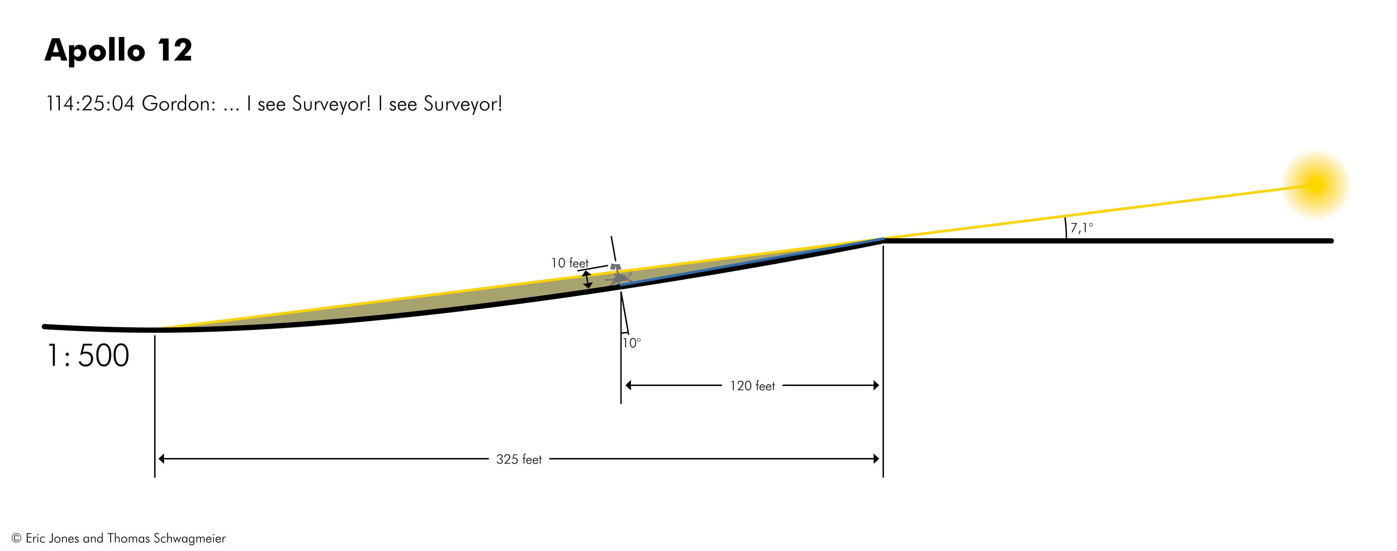 [Comm Break. Although the ground around the Surveyor is still in shadow, the spacecraft is tall enough that the sun is shining on the top of it. In detail, the solar panels on the top of the spacecraft are about ten feet above the ground and the spacecraft is about 120 feet inside the eastern rim of the crater. With a solar elevation of 7.1 degrees and a crater slope of 10 degrees, from the crater rim the shaodwed part of the Surveyor subtends about 3 degrees. At a distance of 120 feet, the shadowed portion is about 6.3 feet and the portion in full sunlight - primarily the solar panels - is about 3.7 feet. See a sketch by Journal Contributor Thomas Schwagmeier.]114:26:22 Gordon: Hey, Ed. That's almost as good as being there.