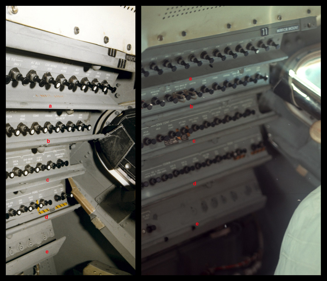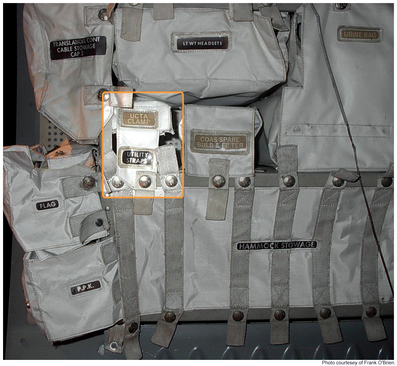[A detail from a photo taken by Frank O'Brien of a LM simulator at the Cradle of Aviation Museum shows the stowage location for utility straps in the Right Hand Side Stowage Compartment (RHSSC).]129:21:40 Bean: We'll do it. (Pause)