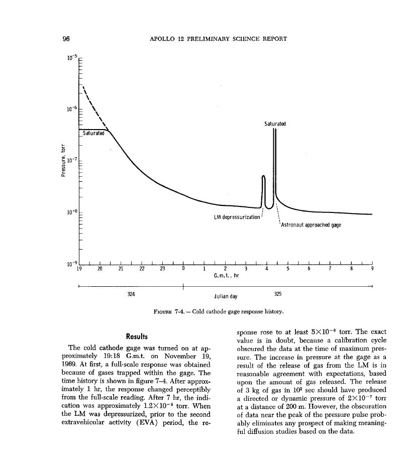 [Under normal conditions, the cabin pressure is maintained at 4.6 psi. They have opened the dump valve, let the cabin pressure drop to 3.5 psi, and then closed the valve again so that they can watch the response of the suit pressure regulators and of the ECS.]131:29:01 Bean: Okay, "3.5. Verify cuff gauge does not drop below 4.8."[As is shown in Figure 7-4 in the Apollo 12 Preliminary Science Report, the Cold Cathode Ion Gauge (CCIG) Pete and Al deployed during EVA-1 recorded the arrival of the vented oxygen. Similar experiments deployed by the Apollo 14 and Apollo 15 crews recorded arrivals in sufficient detail that the signal due to the initial venting down to 3.5 psia can be distinguished from the subsequent full depressurization.
