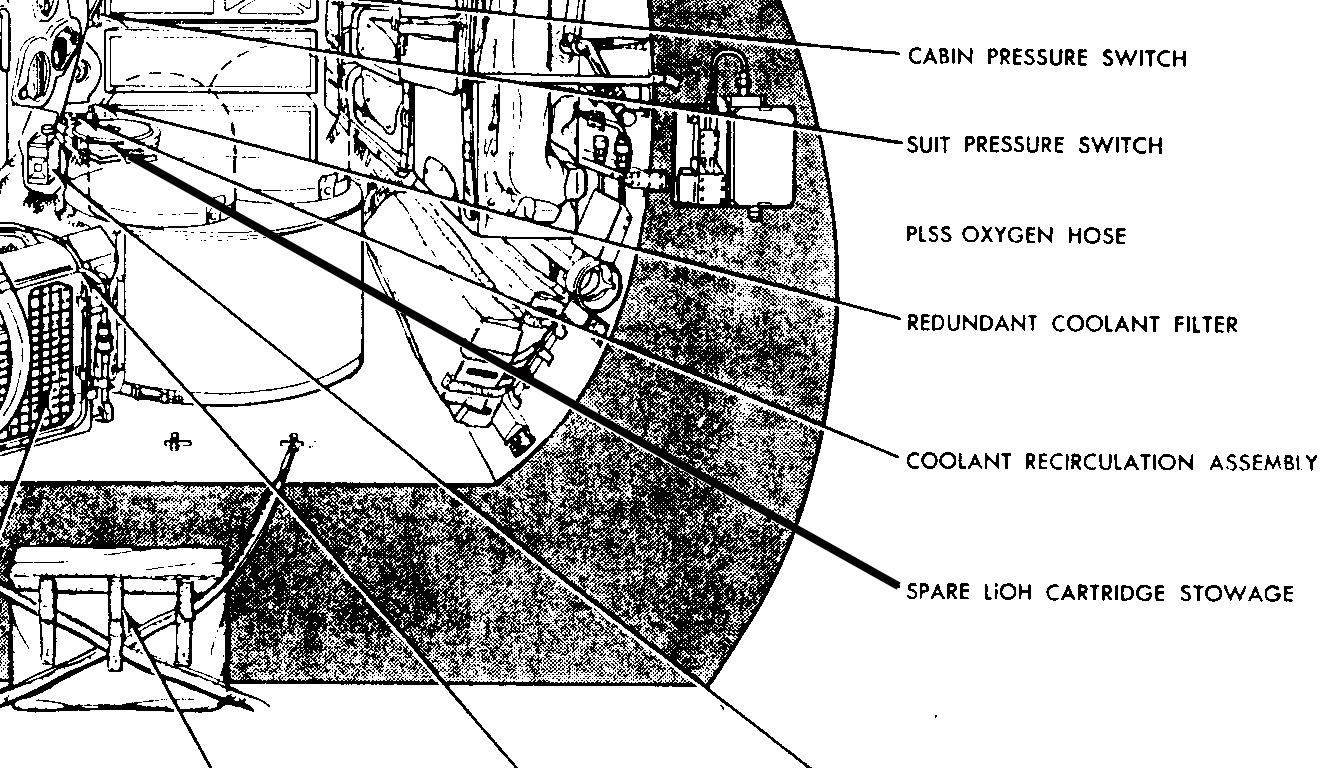 [This bracket held the replacement ECS Primary LiOH canister during the trip out from Earth.]129:16:36 Weitz: Okay. Now, on page 77. (Long Pause)[Conrad - "There's two LiOH canister types. There are the ones that were on the MESA that go into the PLSSs, but there is also one that goes in the ECS System on the LM. So I guess it (the replacement ECS canister) was stowed on the engine cover, in the bracket, and that bracket was removable - because one of the other things we were going to do was to throw everything that was used out the hatch. So they want us to leave that bracket on there so we can tie the camera on it."]