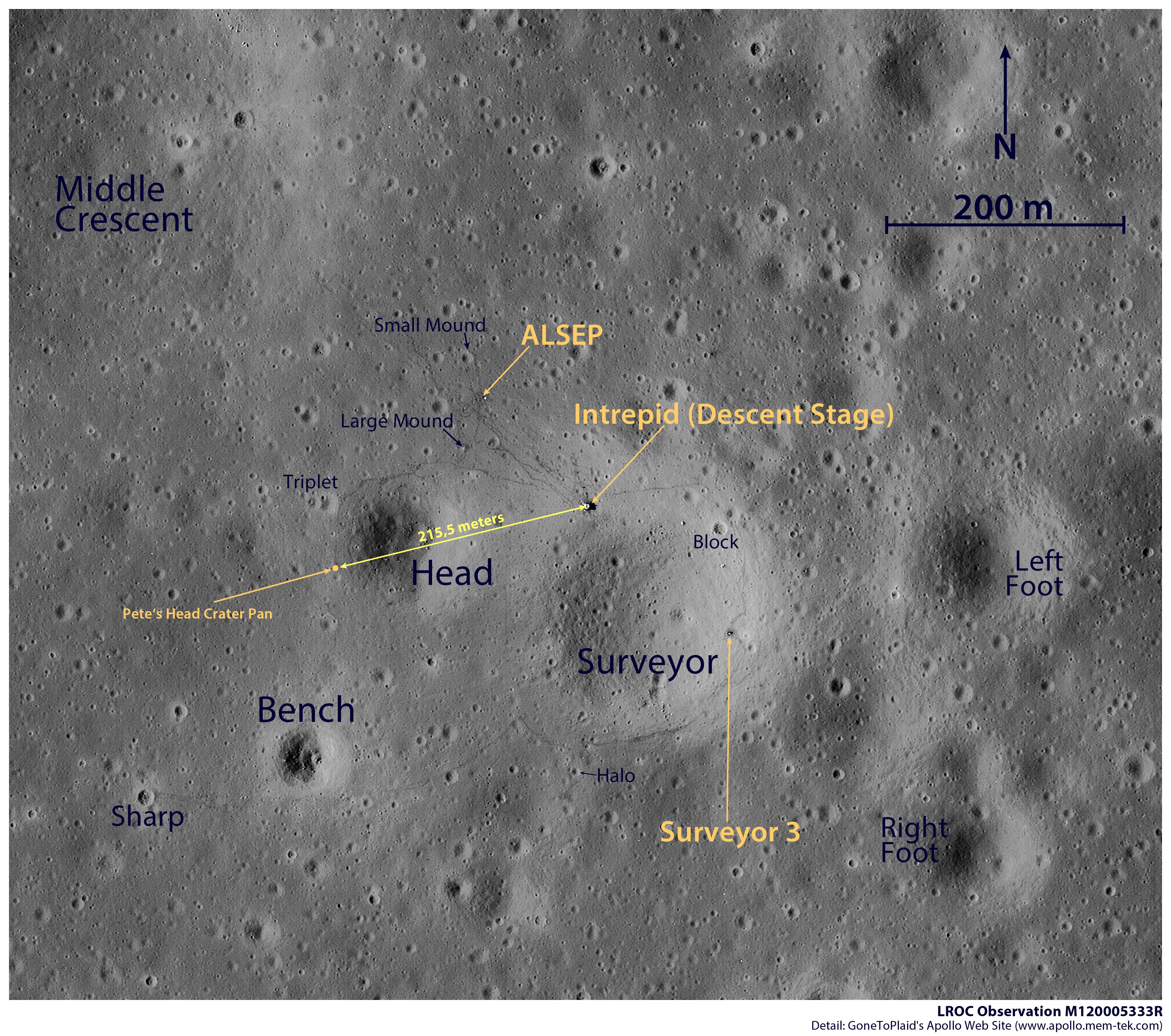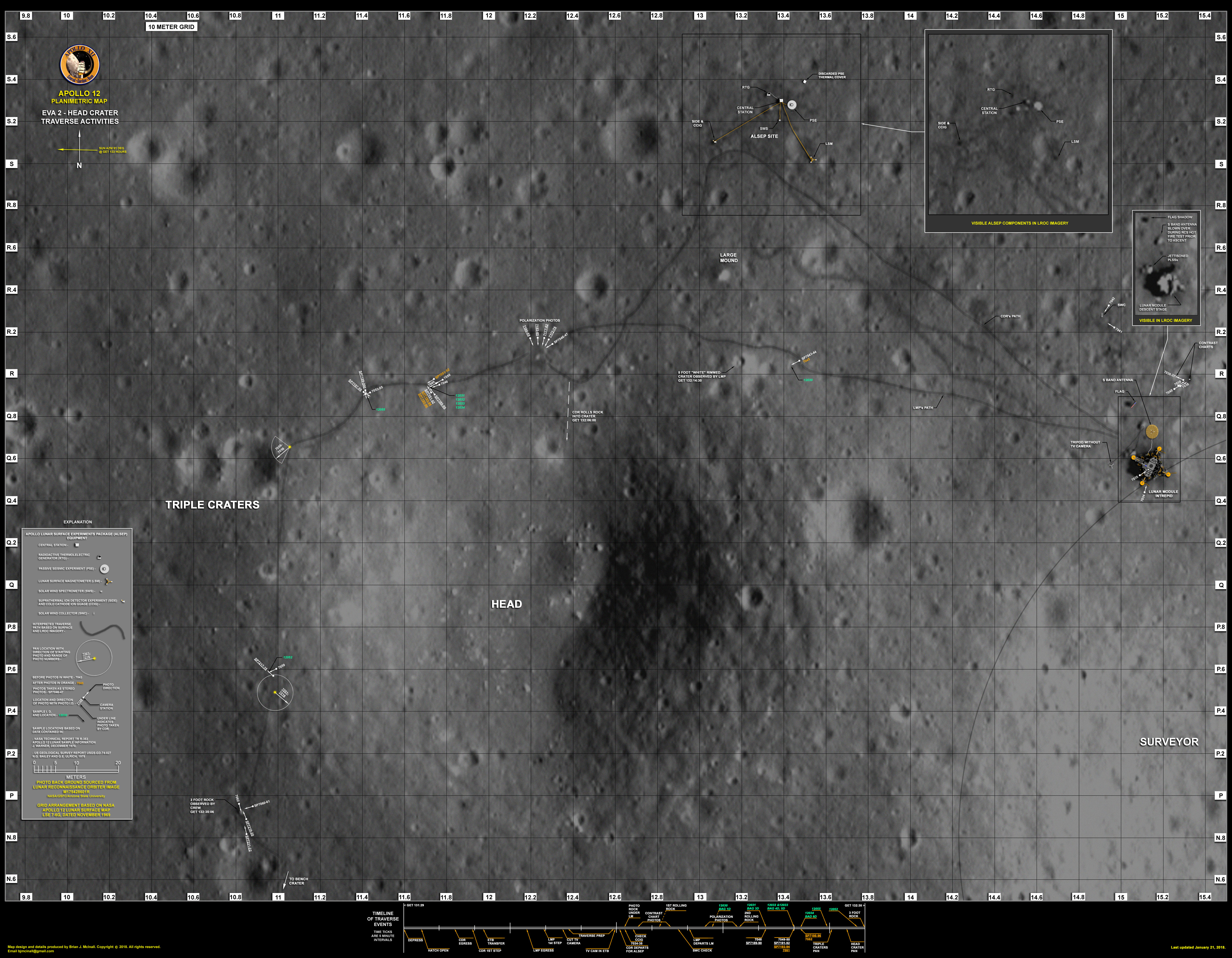 [Brian McInall has created a Planimetric map covering EVA-2 activities at the LM, on the traverse to north rim of Head Crater, and around to the west rim.]132:10:41 Bean: Boy, this Hand Tool Carrier is light and nice compared to carrying it around on Earth. (Pause) I think we might be able to just slip it right down inside the Surveyor crater with us. Piece of cake. Okay. I see you over there; I'm on the way.