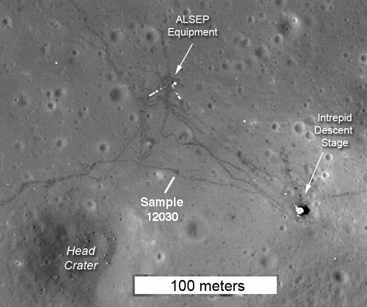 [Al's sample is 12030, and pictures AS12-48- 7043 and 7044 show the crater prior to sampling. The pair have been combined as a red-blue anaglyph.]132:12:54 Conrad: Okay. It's all working out just fine.[The disturbed soil at the sample location is visible in a detail from LROC image M168353795R. On the planimatric map, the location is at R.05/ 13.43. This location agrees well with the estimated position indicated in Figure 10-1 in the Apollo 12 Preliminary Science Report. Al ran about 80 meters from the LM in about 2 minutes, giving an average speed of 2.4 km/hr. A12 PSR scan courtesy Ulli Lotzmann.]