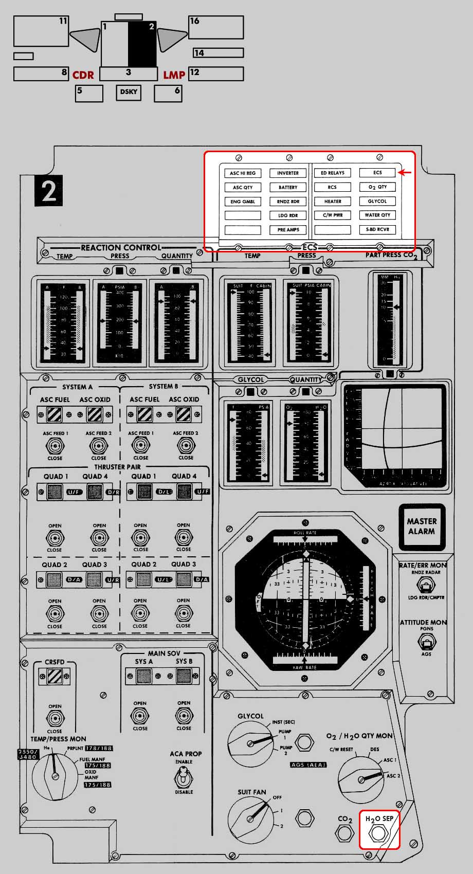 [They are turning on the ECS fan to actually start the flow of oxygen through the suit circuit. The Delta-P sensor looks at a pressure difference across the fan to confirm proper operation.]119:10:33 Bean: And I'll also... Notice "ECS caution (and) H2O SEP (lights out)." And I've got them (that is, the two lights are out). And "Comm (section of CB panel 16), TV (circuit breaker), Open." Houston, do you want me to turn off the TV or leave it on?
