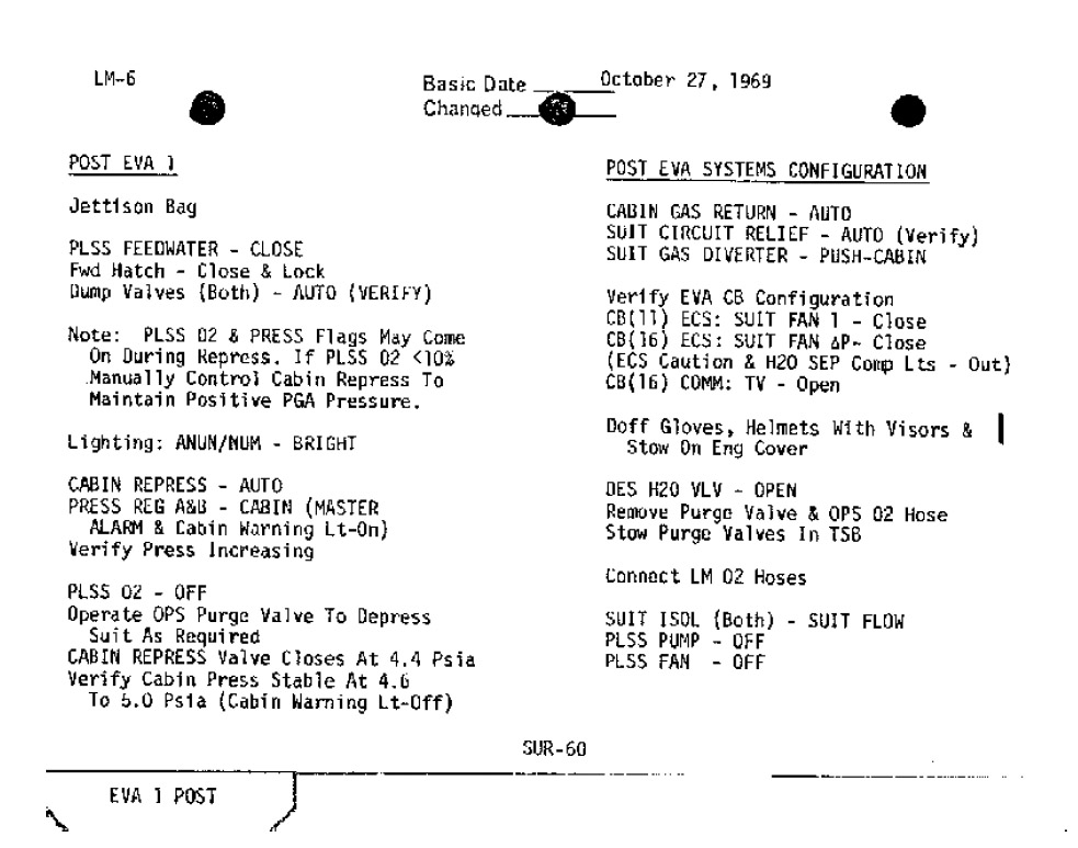[This item is third up from the bottom of the right-hand column on Sur-62. In essence, they will reverse the direction of oxygen flow through the suits, and this will be the next convenient opportunity to check the ECS O2 hoses for water leakage.]120:10:34 Conrad: Okay. Houston. We are just about at that step right now. We're just reconfiguring the cameras. (We'll) keep you posted. The PLSSs are all recharged (with oxygen) and batteries replaced, LiOH canisters (replaced), and first O2 charge (completed).