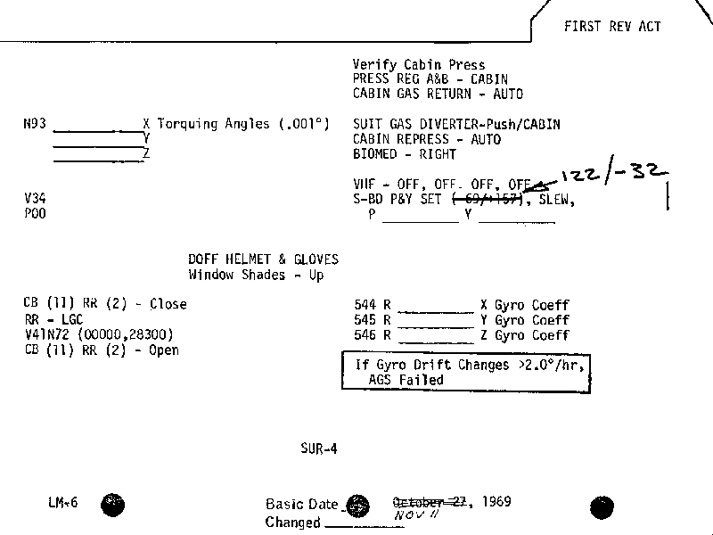 [Comm Break]111:08:56 Conrad: Forget it, Houston. I can do the program over again.[In the handwritten notes in the copy of the Surface checklist used to prepare the Apollo 12 Journal, the navigation stars to be used are referenced by three digit numbers. The first digit indicates which AOT detent in likely to show the star, and the other two digits identify the star in the Apollo 12 list of navigation stars. The first star they are using is 'Sirius 115'. The first digit, '1' means that they should find Sirius in AOT detent 1. The second and third digits indicate that the guidance computer knows Sirius as star number 15. The second star is 'Pollux 200'. Pollux doesn't appear in the Apollo 12 star list but here, it is being used as a convenient target. Star designation '00' in the Star list is available for entry of a particularly suitable object, be it a planet or a star. Here, they are using Pollux as Star 00 and expect to find it in AOT detent 2. Sur-6, the three-axis coordinates for Pollux are written in by hand. These numbers were given to the guidance computer at some point for stowage in the portion of memory devoted to Star 00. There is no mention of Pollux prior to 111:06:44 in the Apollo 12 Technical Air-to-ground transcript, suggesting that use of Pollux for Star 00 was decided before launch from Florida.]