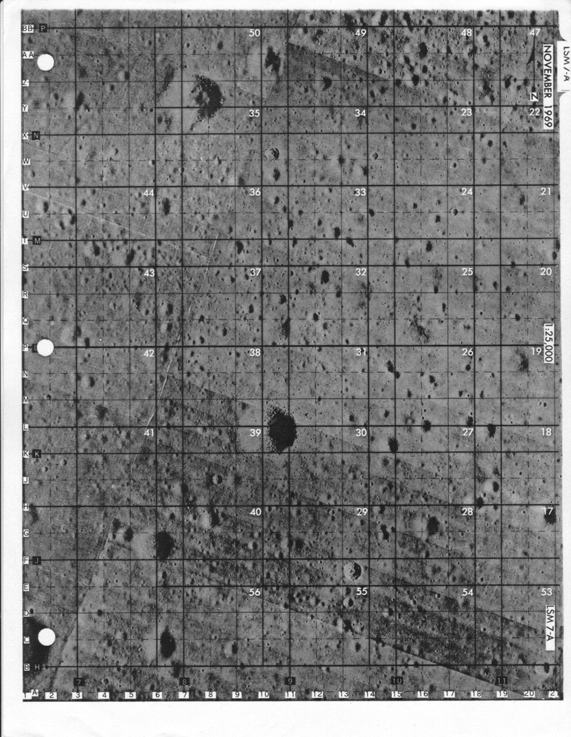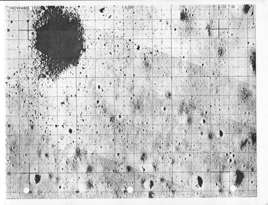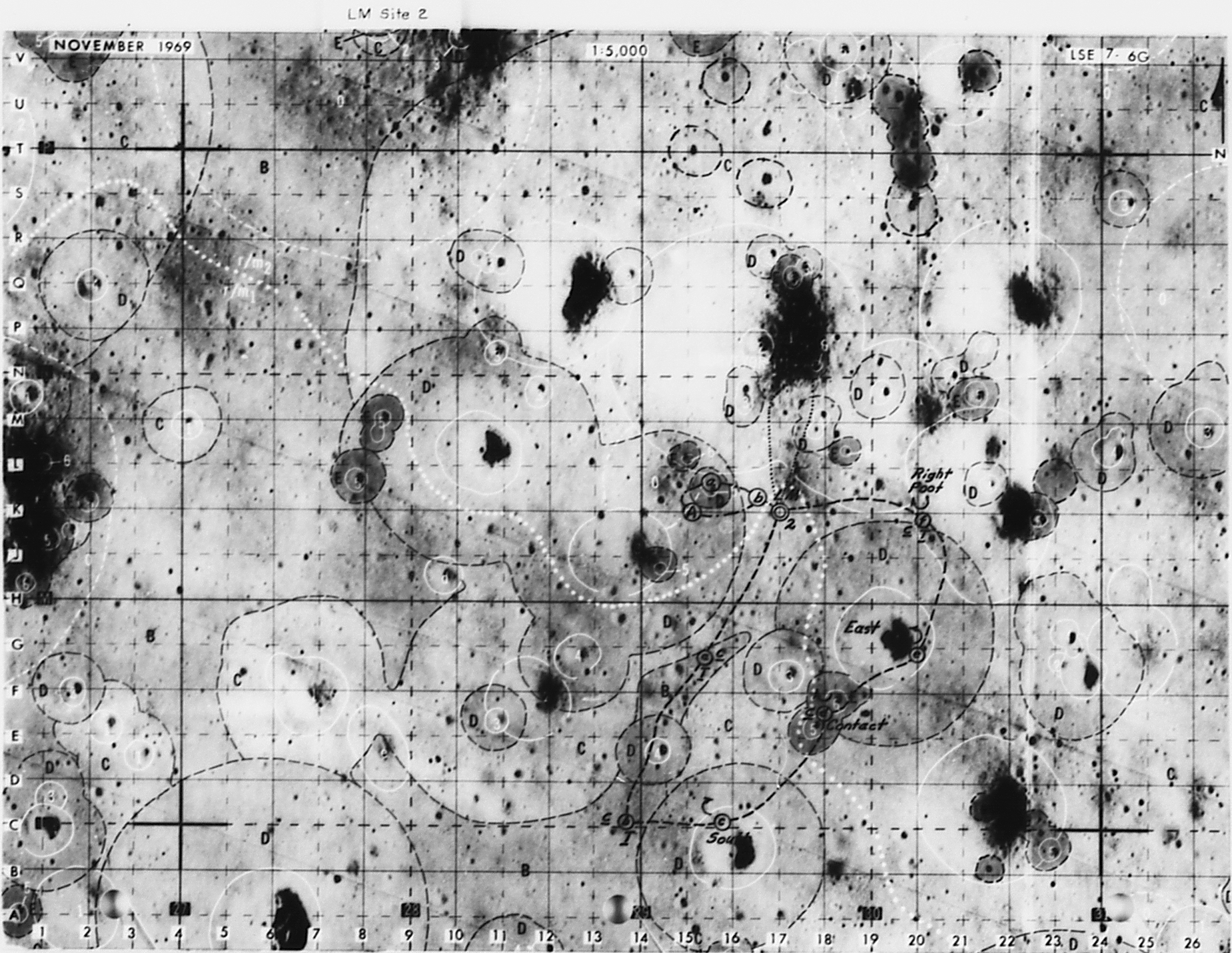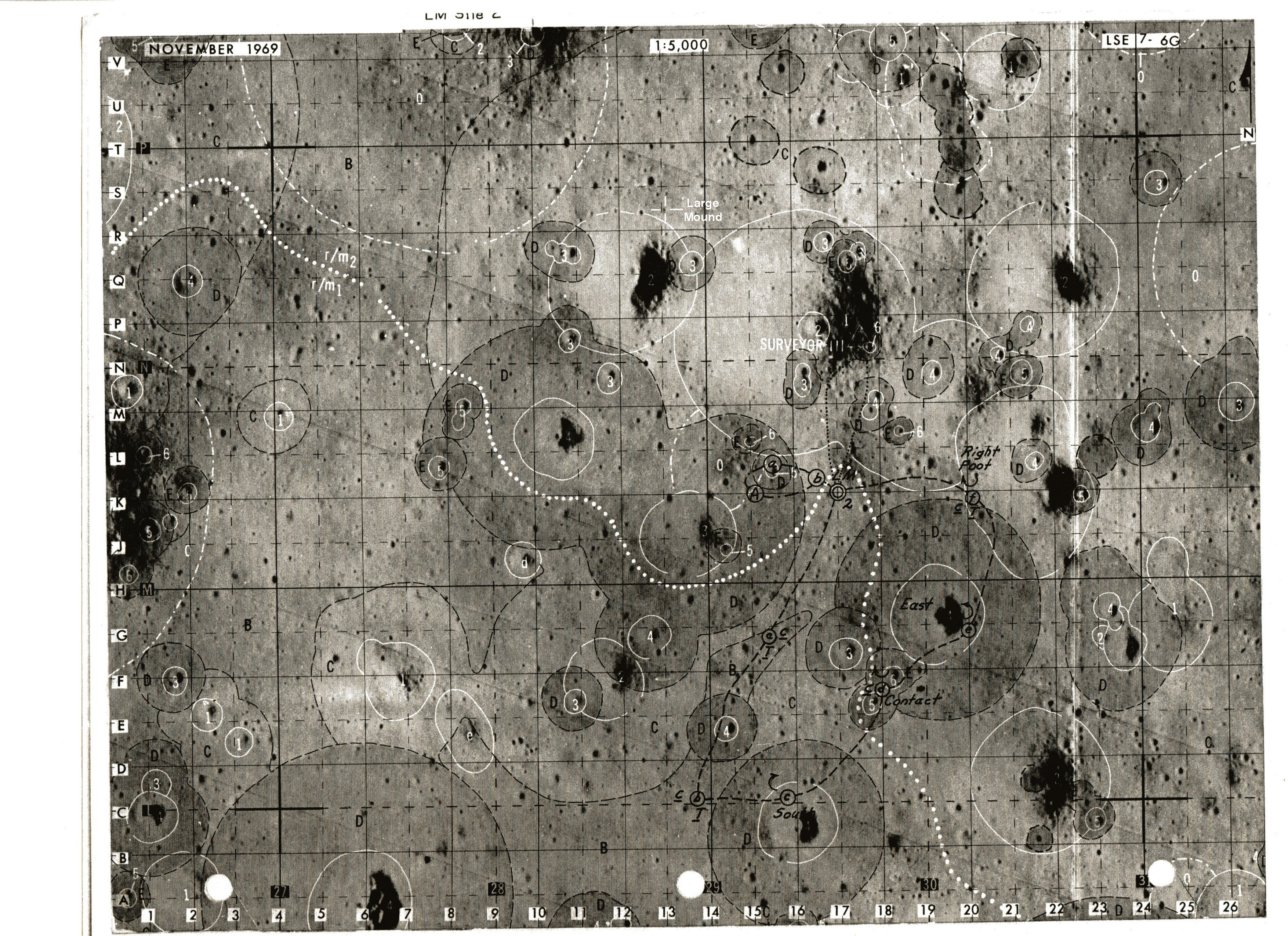 [Bean - "They had it sitting on a slope, an eleven degree slope (to correspond to the slope of the inner wall of the crater where Surveyor III landed). We practiced doing that. It's interesting (that), when they first gave it to us, they didn't know where it was, either (see below). They had ideas of which crater it was in, but they never really worried about it because it wasn't that important. But, once we were going there, they had to establish on the map which one of these craters (was the right one)."]