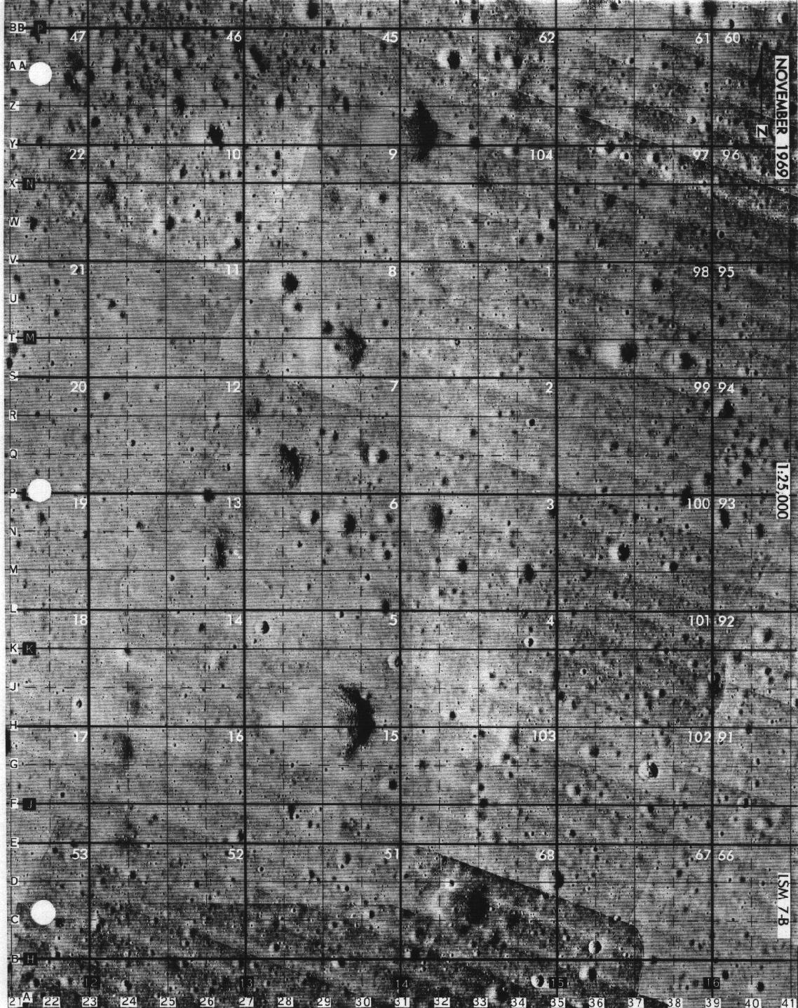 [With regard to the exact location of Surveyor III, Ewan Whitaker was heavily involved in analysis of photographic data from the Ranger, Lunar Orbiter, and Surveyor programs and undertook his successful search for the exact landing in the months immediately following the Surveyor III landing on April 20, 1967. In a 1991 telephone conversation, he told me that guidance and tracking data provided bounds for the search area and that is was then a matter of comparing features seen in pictures taken by the Surveyor III with details in high-resolution Lunar Orbiter pictures of the area. The Surveyor pictures gave information on the size and shape of the crater that the spacecraft had landed in but, of course, there were several craters in the search area that fit the bill. However, the Surveyor pictures also showed a number of rocks - ejecta from Block Crater on the north wall - laid out in a distinctive pattern. Because these rocks were small enough to be near the limit of resolution in the Orbiter pictures, finding a match was not a simple task but eventually, Whitaker was satisfied that he had found the right crater and published his result in the 1967 NASA document "Surveyor III: a preliminary report".]